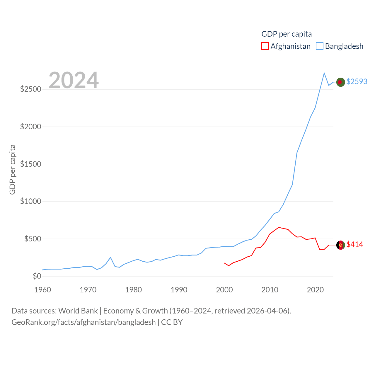 By GDP, Afghanistan ranks 137/197 ($17.2B) and Bangladesh ranks 36/197 ($450B). By GDP per capita, Afghanistan ranks 196/197 ($414), while Bangladesh ranks 146/197 ($2,593).