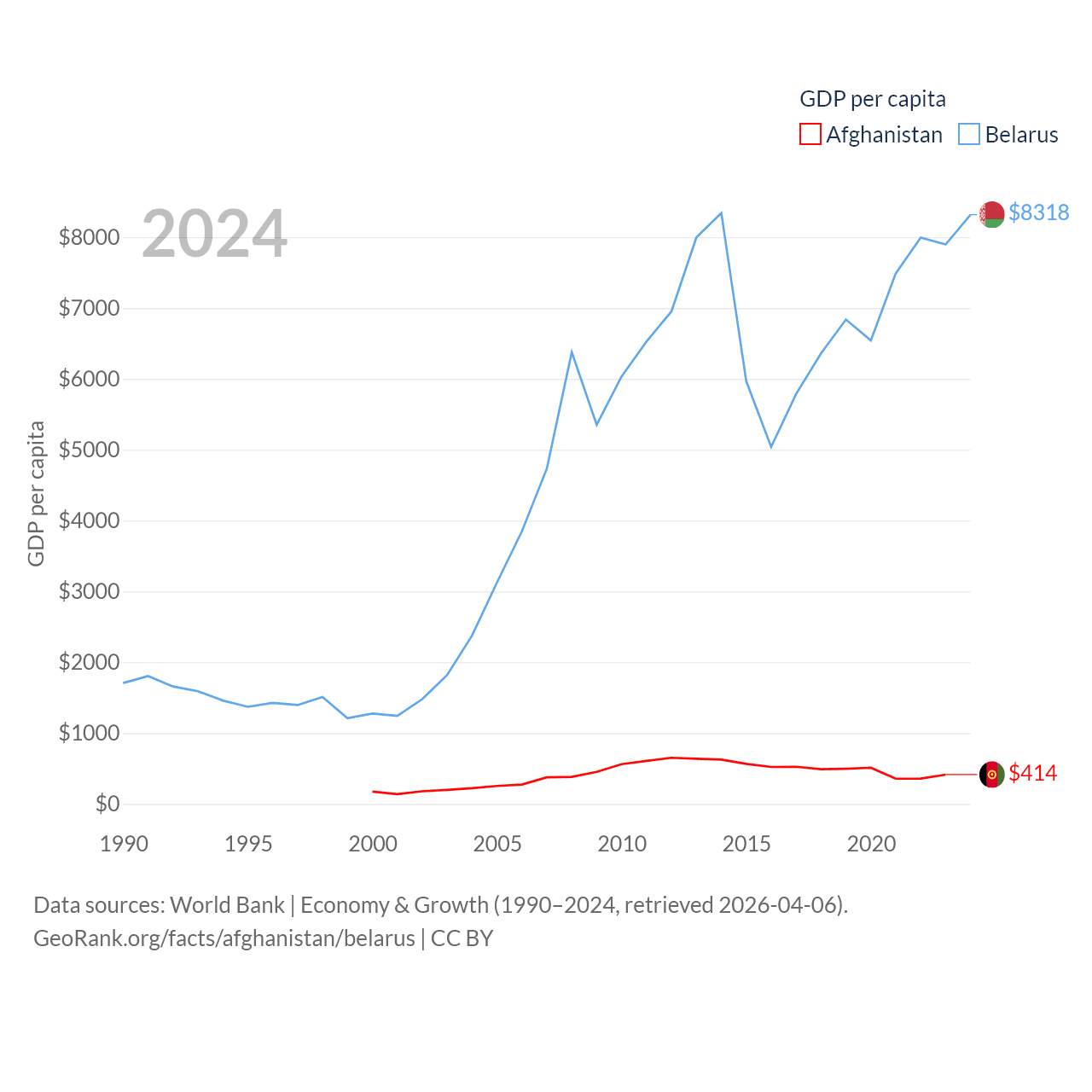 By GDP, Afghanistan ranks 137/197 ($17.2B) and Belarus ranks 83/197 ($76B). By GDP per capita, Afghanistan ranks 196/197 ($414), while Belarus ranks 92/197 ($8,318).