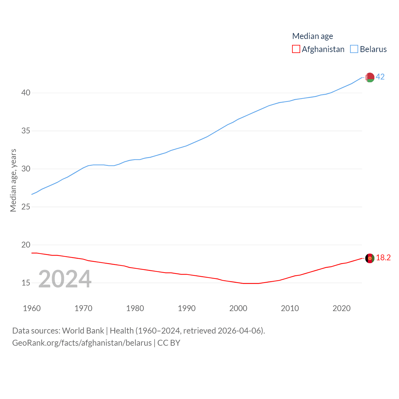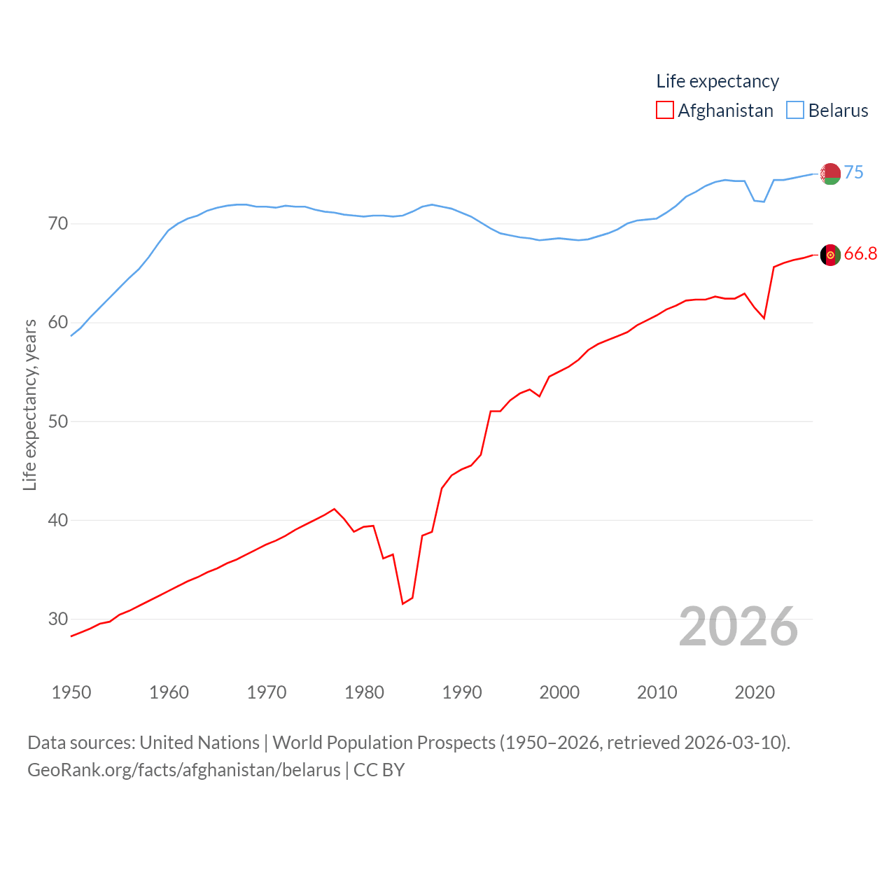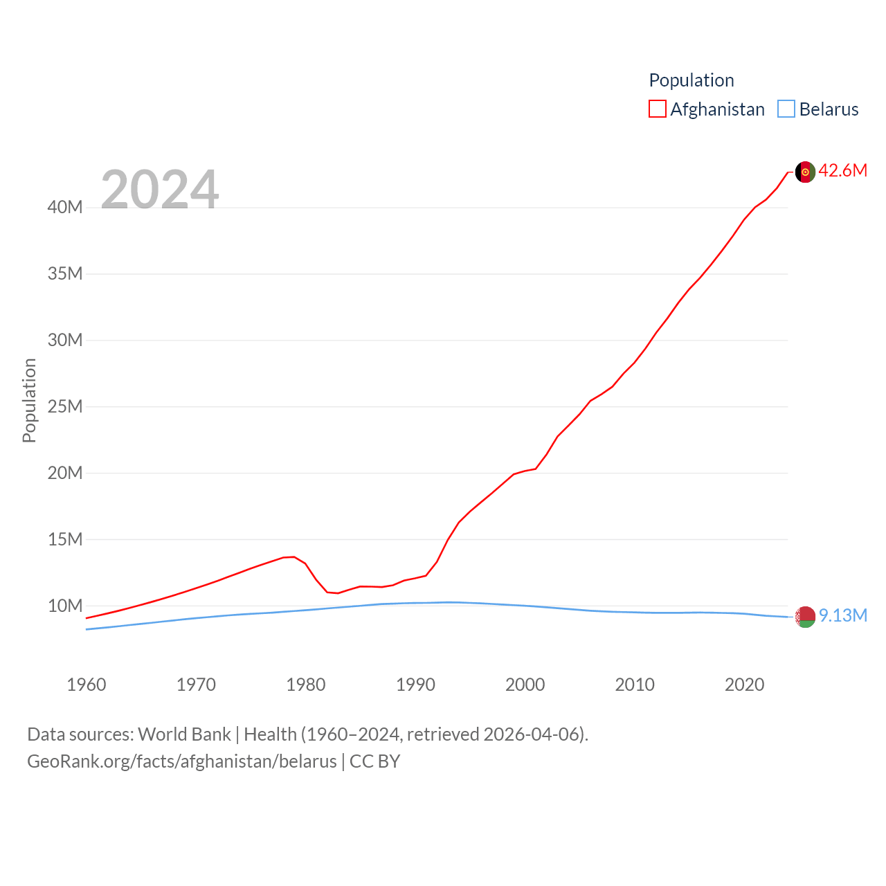 Afghanistan has a population of 42.6M (ranked 36/197), compared with 9.13M in Belarus (ranked 100/197). Afghanistan's land area is 251,827 sq mi versus 78,372 sq mi for Belarus (ranked 40th vs. 83rd).