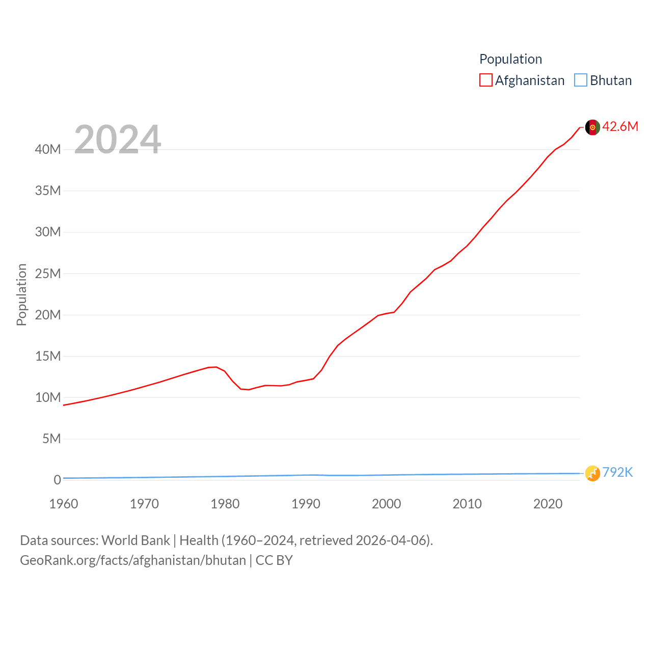 Afghanistan has a population of 42.6M (ranked 36/197), compared with 792K in Bhutan (ranked 163/197). Afghanistan's land area is 251,827 sq mi versus 14,726 sq mi for Bhutan (ranked 40th vs. 132nd).