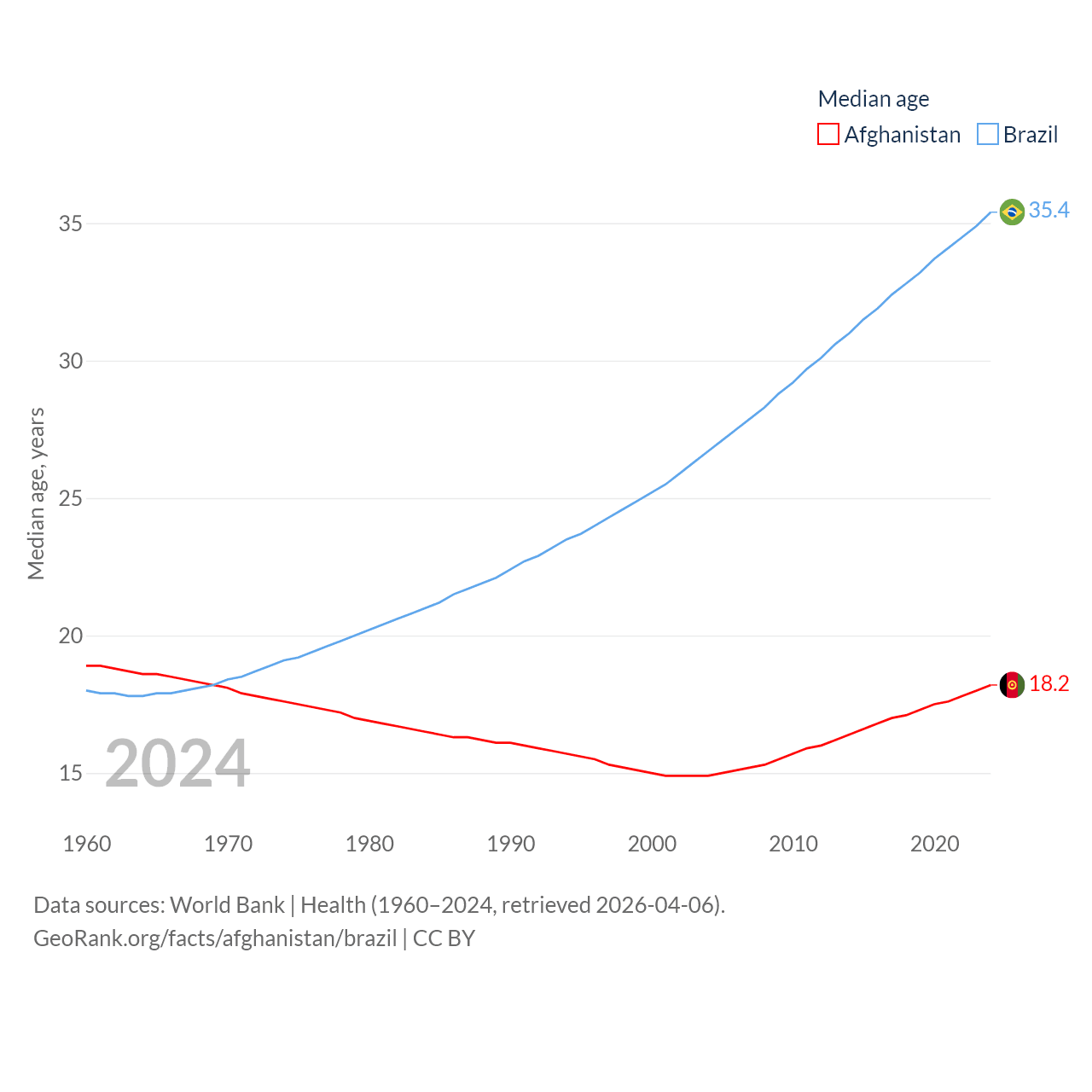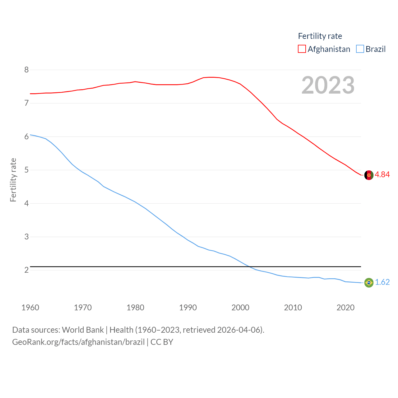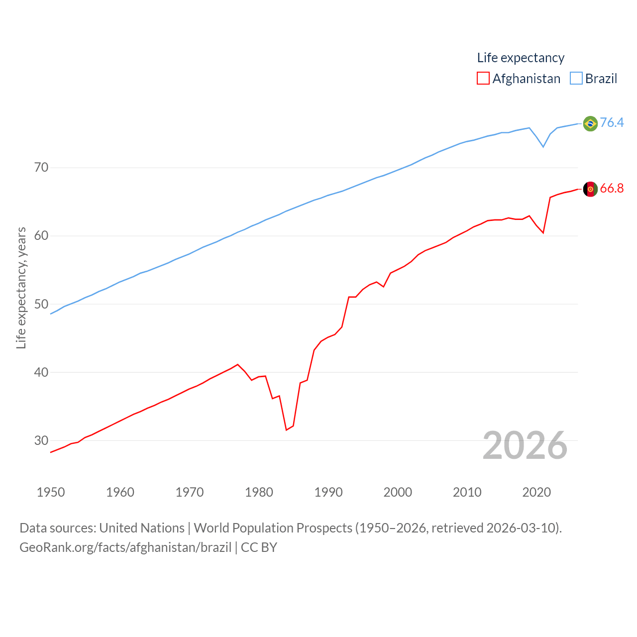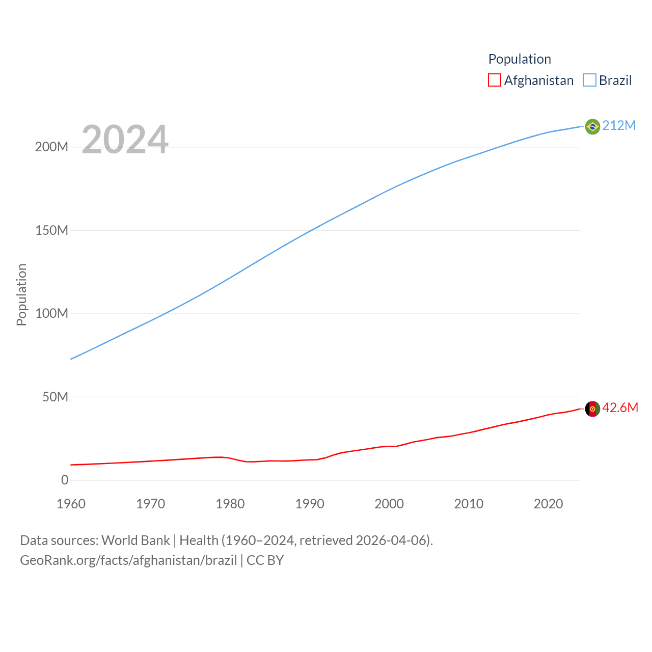 Afghanistan has a population of 42.6M (ranked 36/197), compared with 212M in Brazil (ranked 7/197). Afghanistan's land area is 251,827 sq mi versus 3,227,096 sq mi for Brazil (ranked 40th vs. 5th).