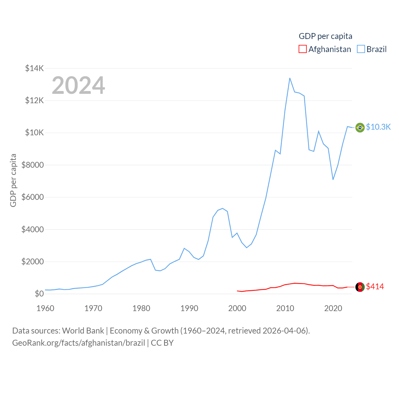 By GDP, Afghanistan ranks 137/197 ($17.2B) and Brazil ranks 10/197 ($2.19T). By GDP per capita, Afghanistan ranks 196/197 ($414), while Brazil ranks 85/197 ($10,311).