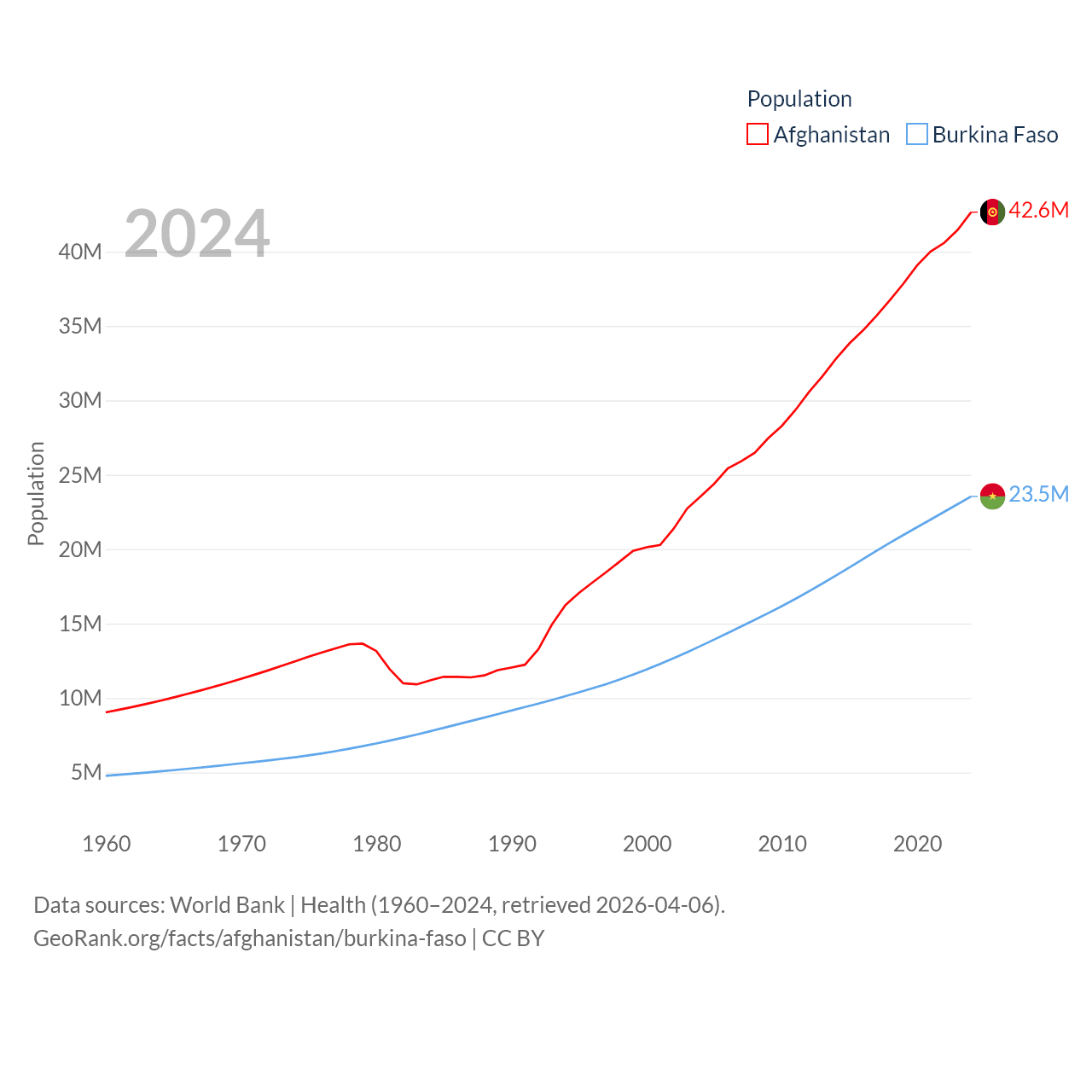 Afghanistan has a population of 42.6M (ranked 36/197), compared with 23.5M in Burkina Faso (ranked 59/197). Afghanistan's land area is 251,827 sq mi versus 105,638 sq mi for Burkina Faso (ranked 40th vs. 73rd).
