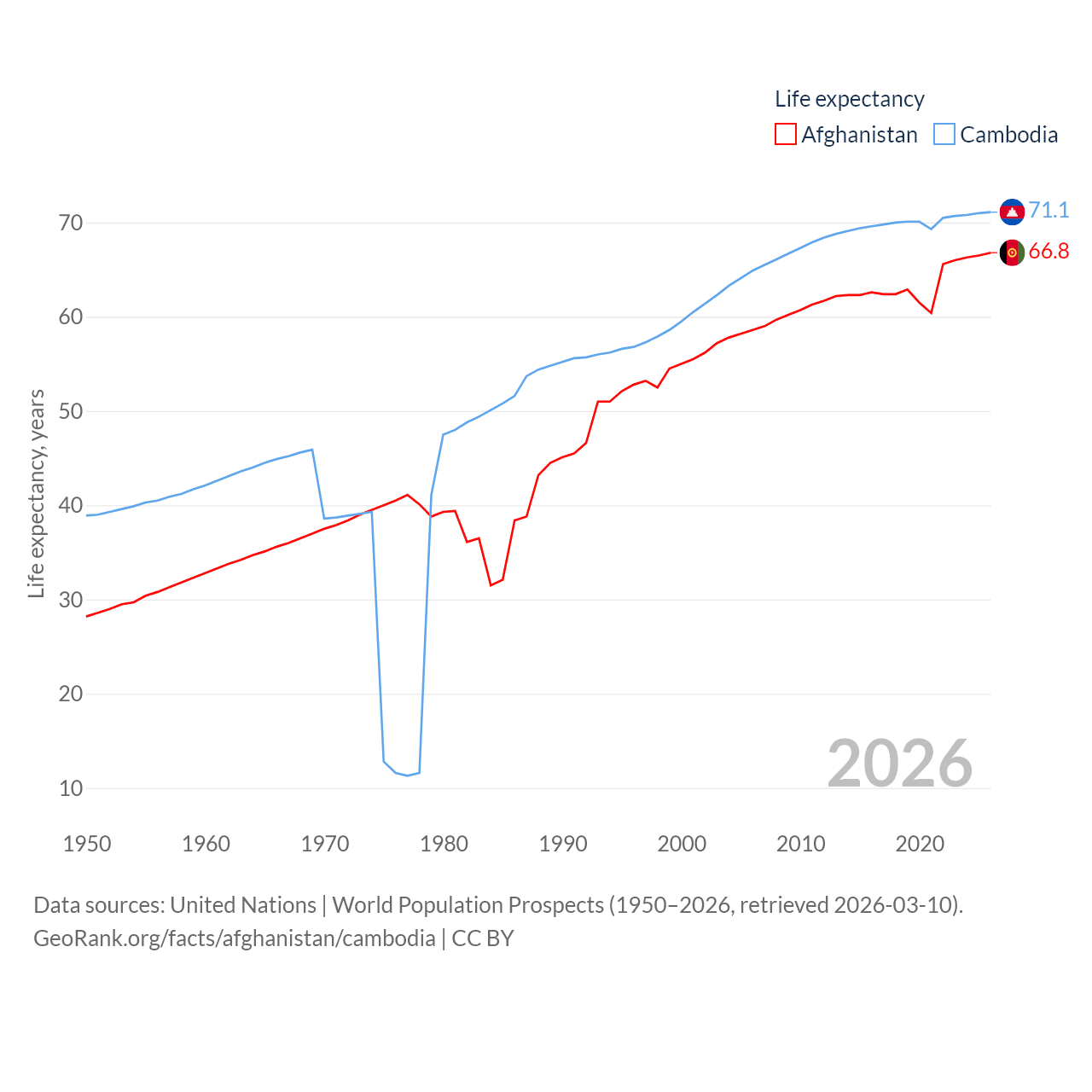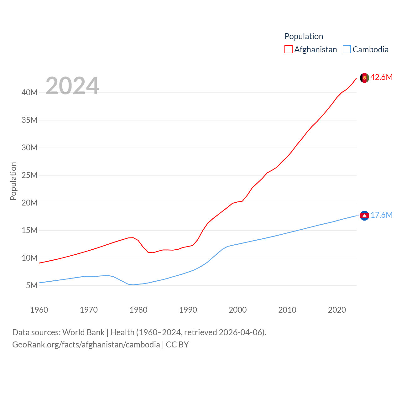 Afghanistan has a population of 42.6M (ranked 36/197), compared with 17.6M in Cambodia (ranked 73/197). Afghanistan's land area is 251,827 sq mi versus 68,155 sq mi for Cambodia (ranked 40th vs. 88th).