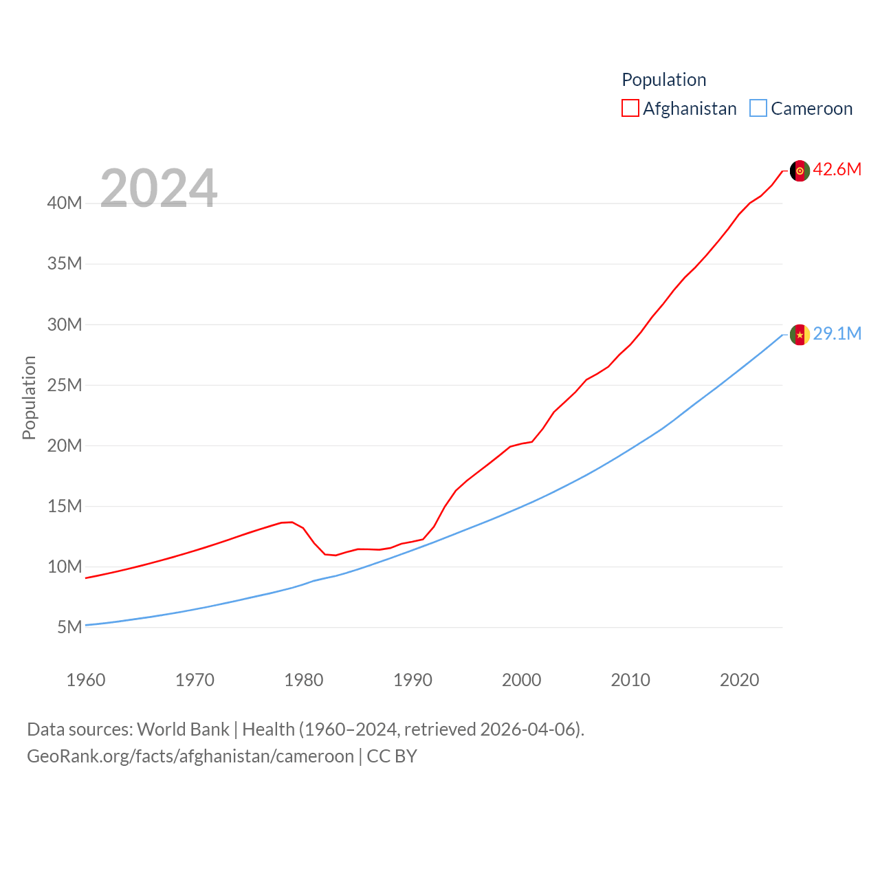 Afghanistan has a population of 42.6M (ranked 36/197), compared with 29.1M in Cameroon (ranked 52/197). Afghanistan's land area is 251,827 sq mi versus 182,514 sq mi for Cameroon (ranked 40th vs. 52nd).