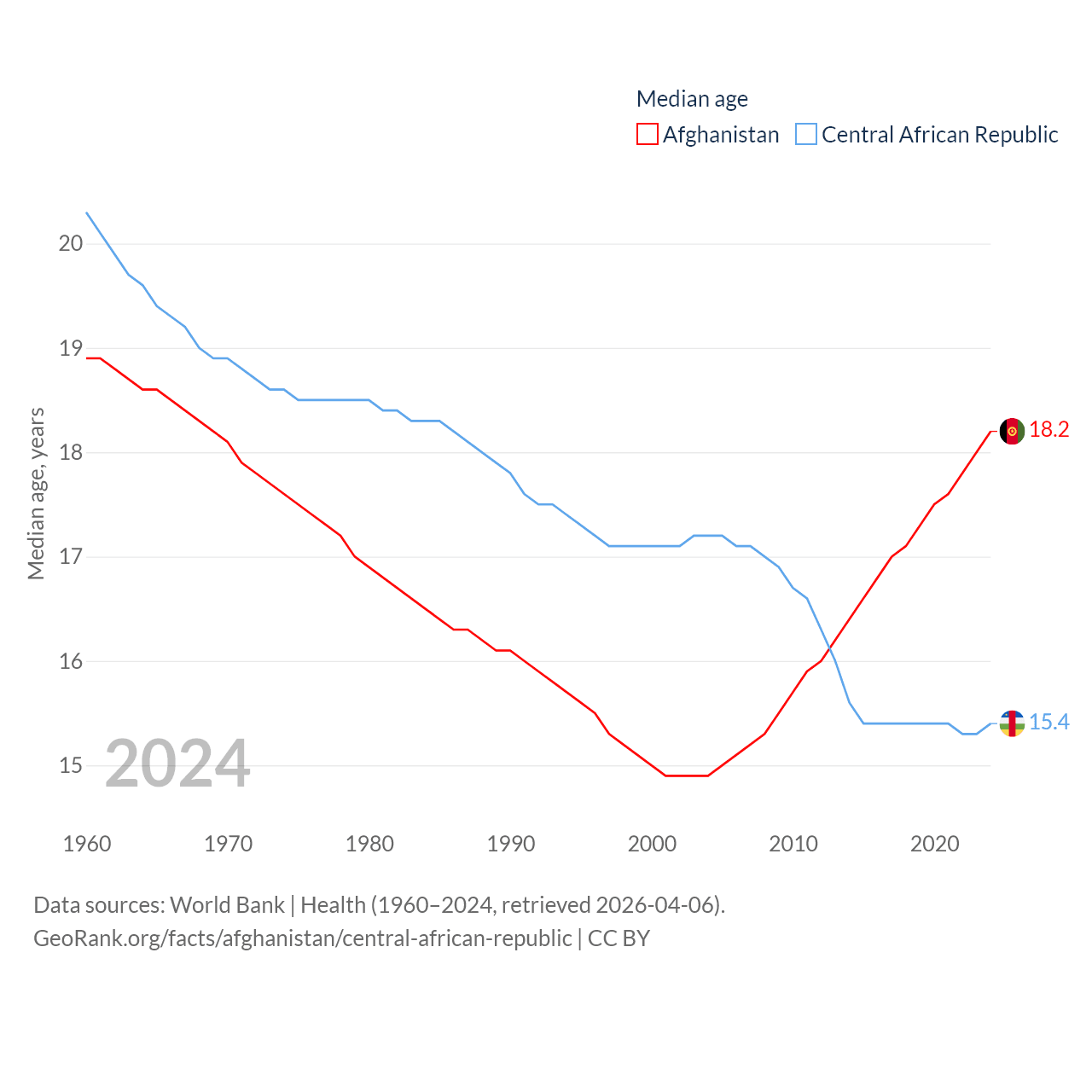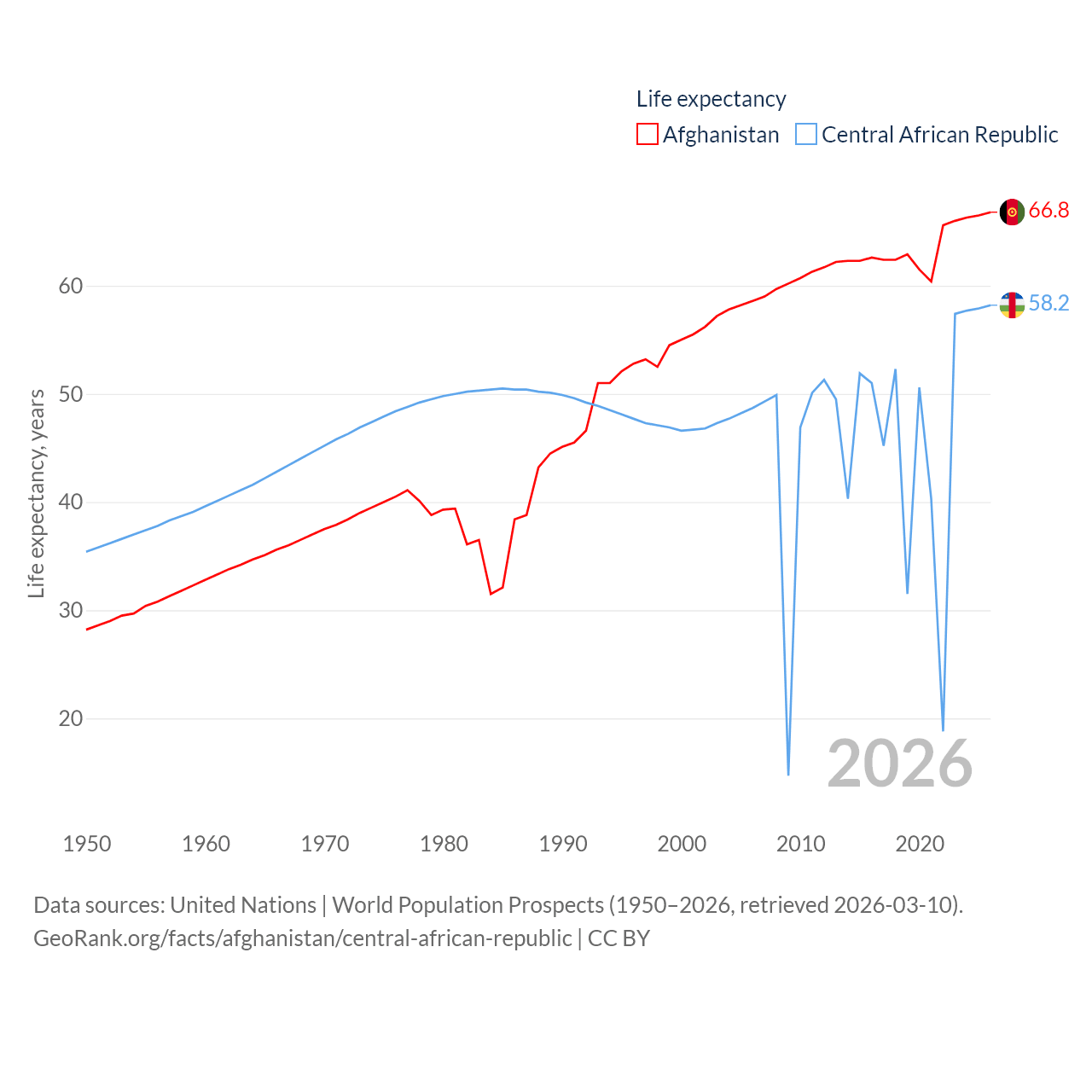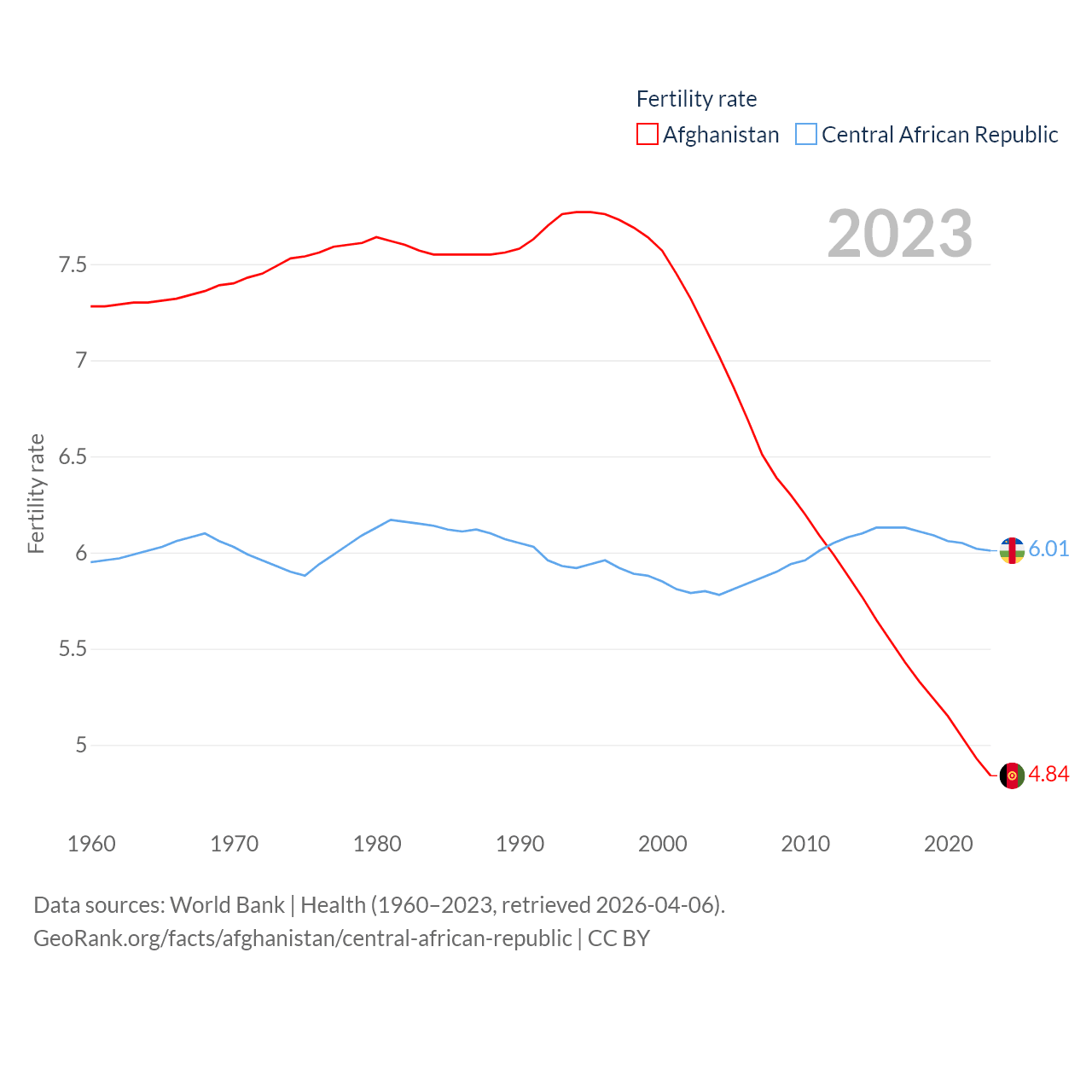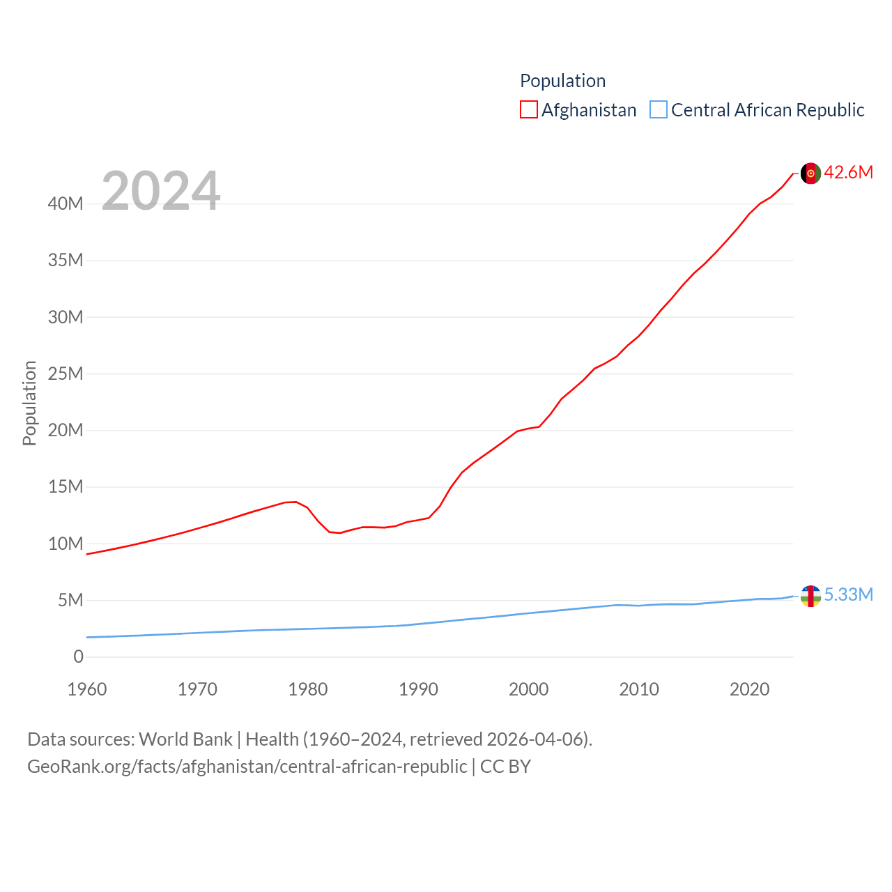 Afghanistan has a population of 42.6M (ranked 36/197), compared with 5.33M in The Central African Republic (ranked 121/197). Afghanistan's land area is 251,827 sq mi versus 240,534 sq mi for The Central African Republic (ranked 40th vs. 43rd).