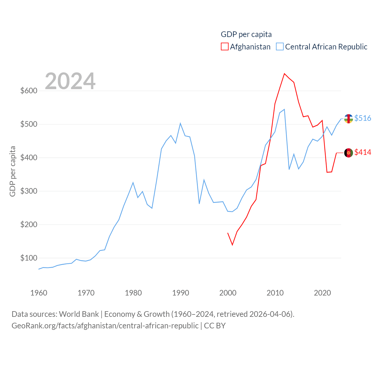 By GDP, Afghanistan ranks 137/197 ($17.2B) and The Central African Republic ranks 171/197 ($2.75B). By GDP per capita, Afghanistan ranks 196/197 ($414), while The Central African Republic ranks 195/197 ($516).