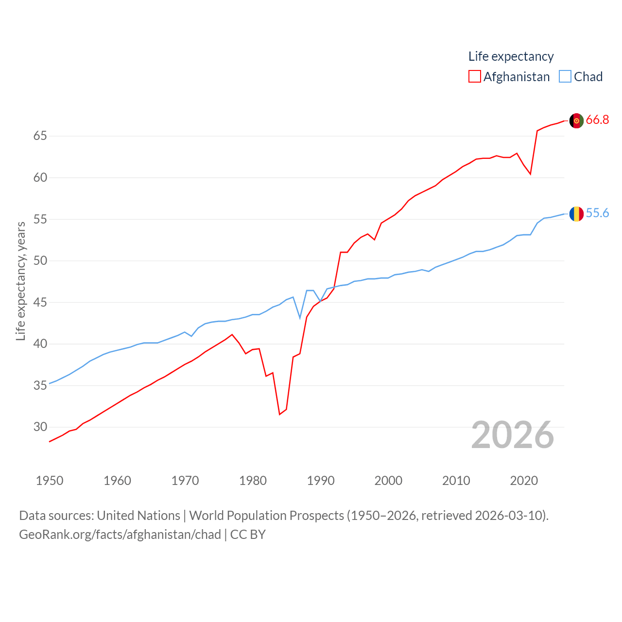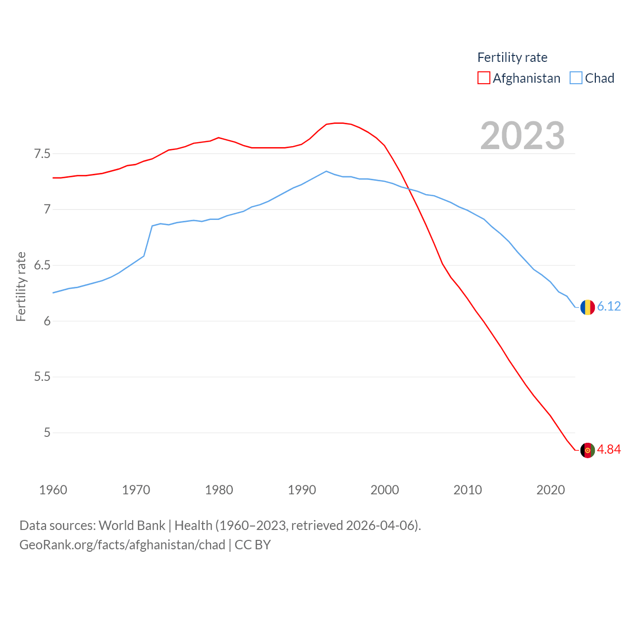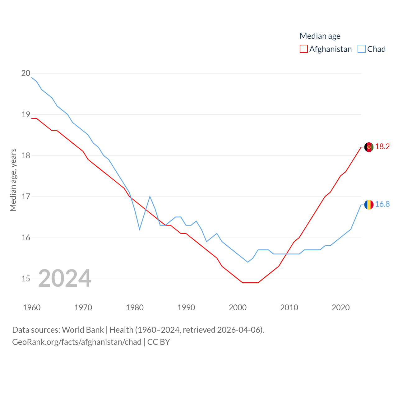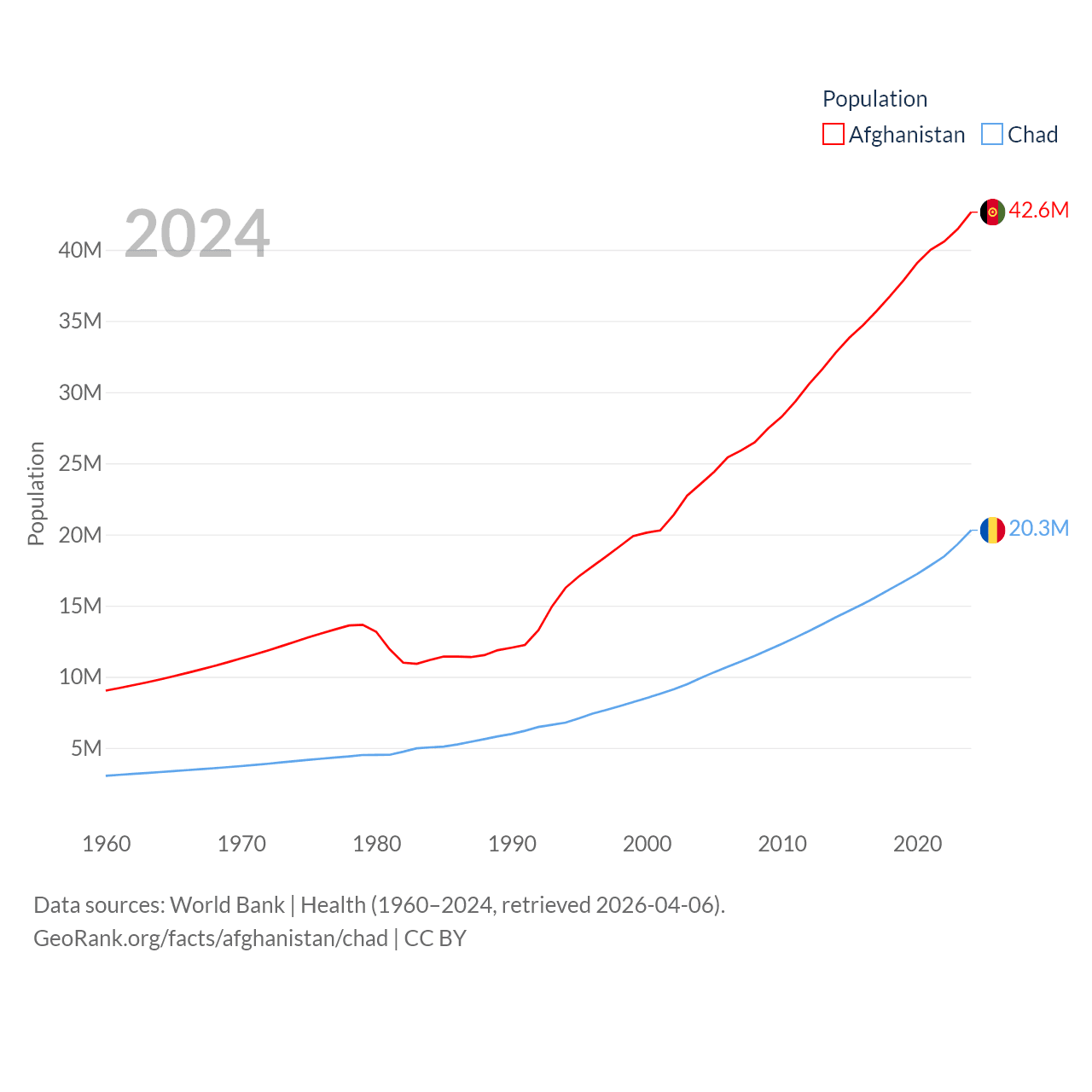 Afghanistan has a population of 42.6M (ranked 36/197), compared with 20.3M in Chad (ranked 65/197). Afghanistan's land area is 251,827 sq mi versus 486,180 sq mi for Chad (ranked 40th vs. 21st).