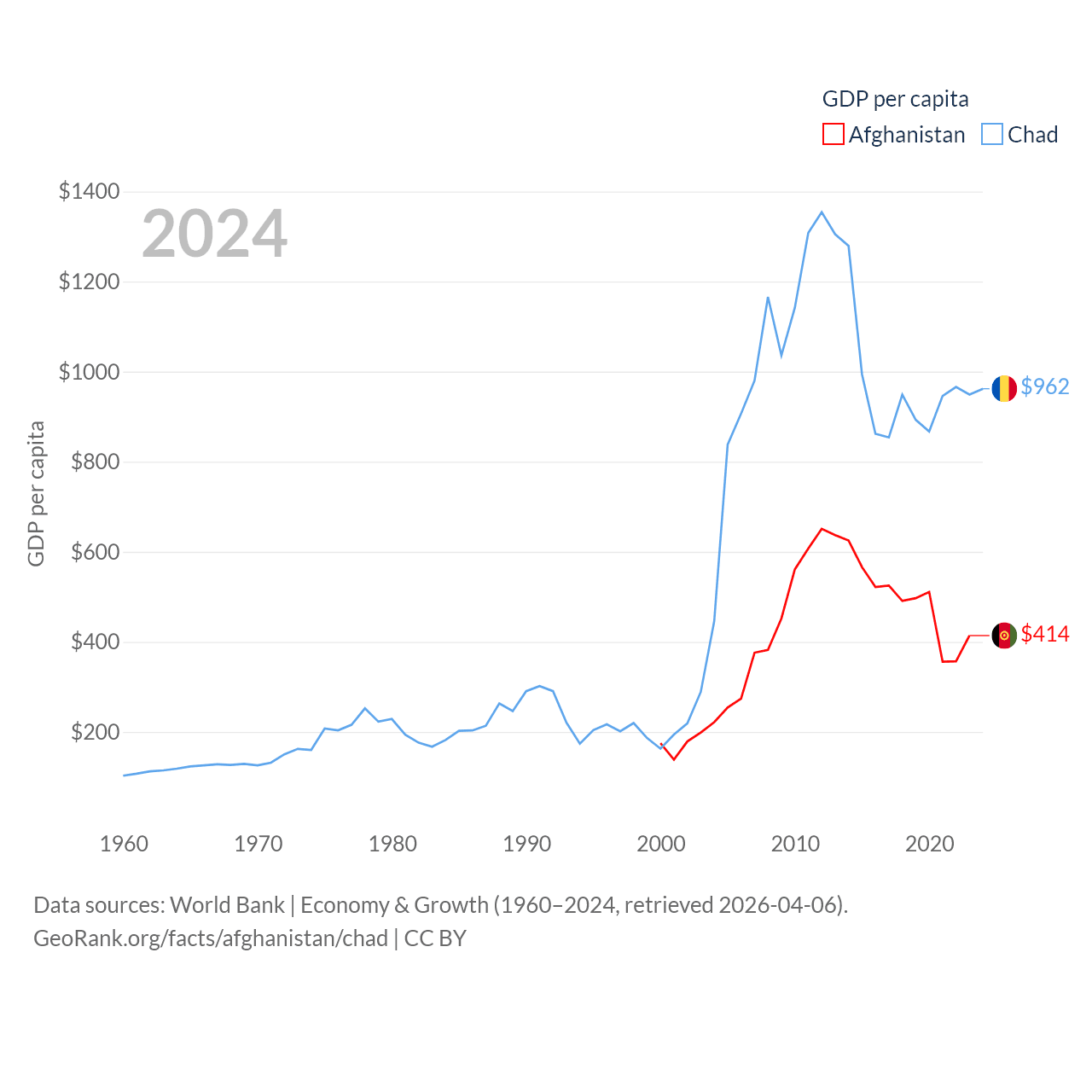 By GDP, Afghanistan ranks 137/197 ($17.2B) and Chad ranks 132/197 ($19.5B). By GDP per capita, Afghanistan ranks 196/197 ($414), while Chad ranks 182/197 ($962).