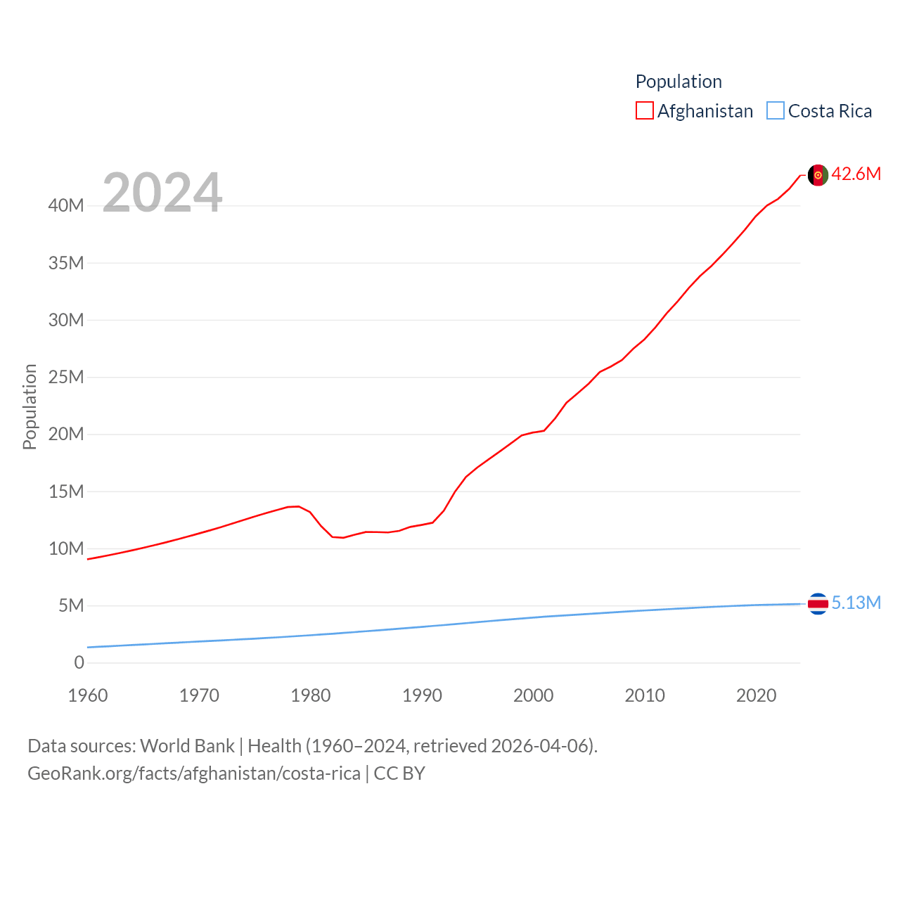 Afghanistan has a population of 42.6M (ranked 36/197), compared with 5.13M in Costa Rica (ranked 126/197). Afghanistan's land area is 251,827 sq mi versus 19,714 sq mi for Costa Rica (ranked 40th vs. 126th).