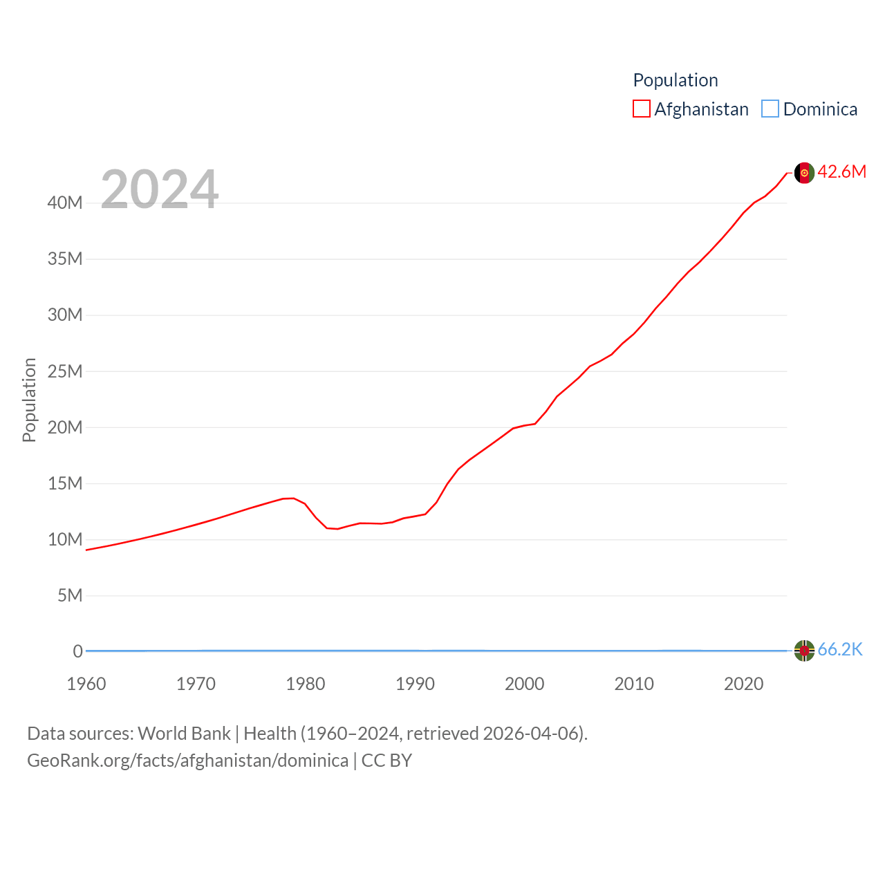 Afghanistan has a population of 42.6M (ranked 36/197), compared with 66.2K in Dominica (ranked 188/197). Afghanistan's land area is 251,827 sq mi versus 289.6 sq mi for Dominica (ranked 40th vs. 175th).