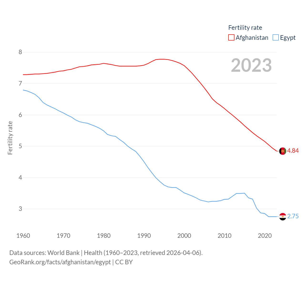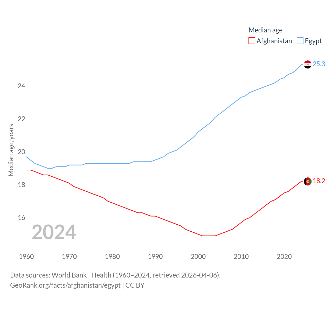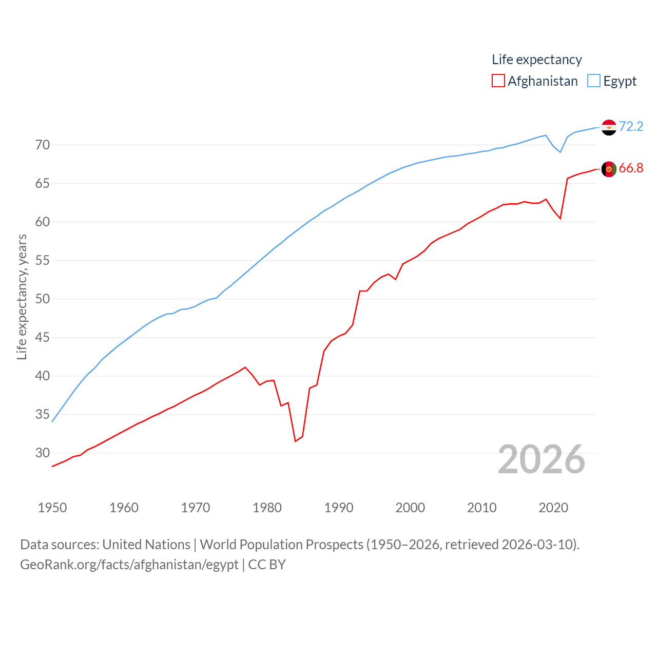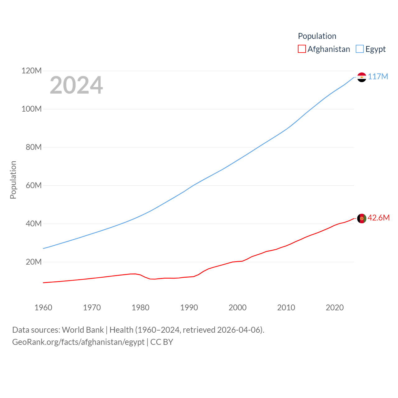 Afghanistan has a population of 42.6M (ranked 36/197), compared with 117M in Egypt (ranked 13/197). Afghanistan's land area is 251,827 sq mi versus 384,345 sq mi for Egypt (ranked 40th vs. 29th).