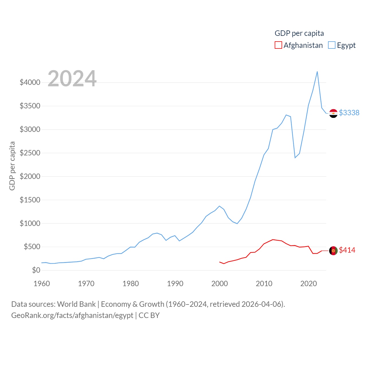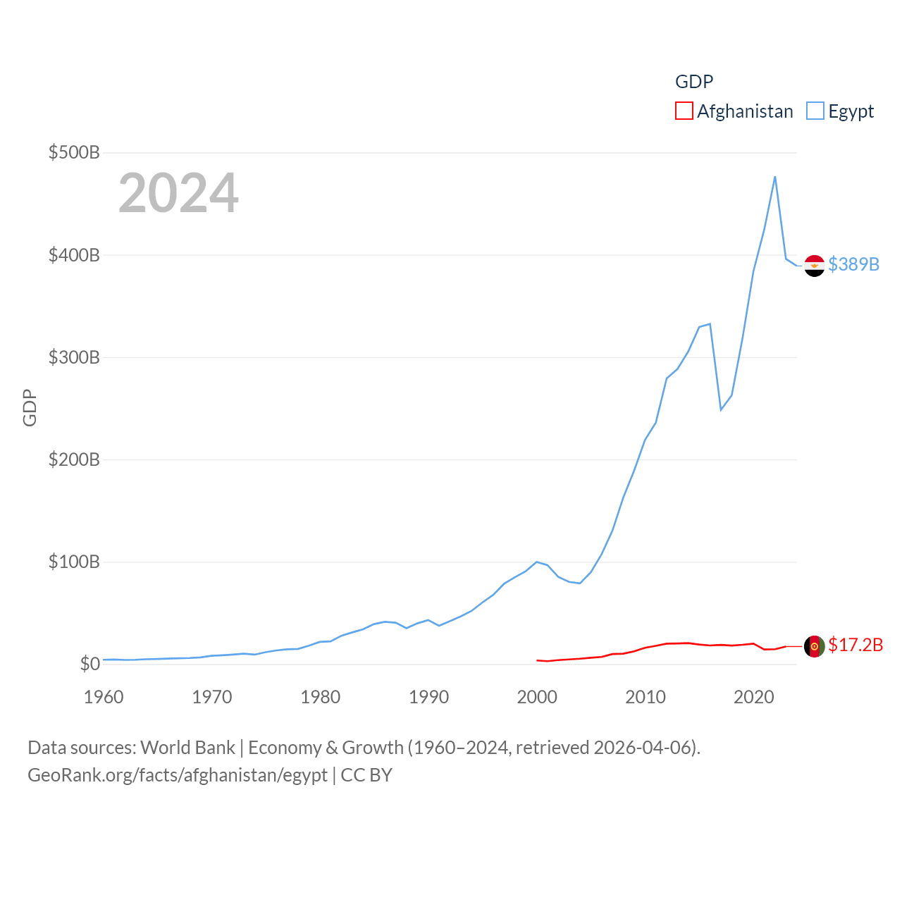 By GDP, Afghanistan ranks 137/197 ($17.2B) and Egypt ranks 41/197 ($389B). By GDP per capita, Afghanistan ranks 196/197 ($414), while Egypt ranks 138/197 ($3,338).