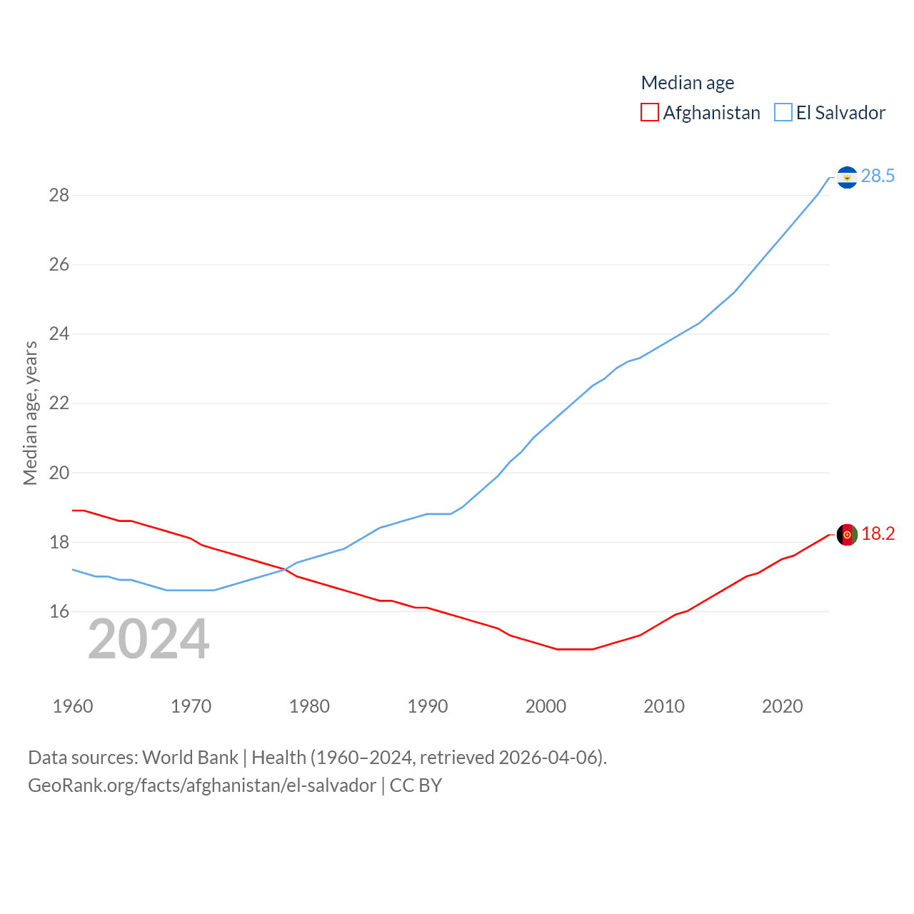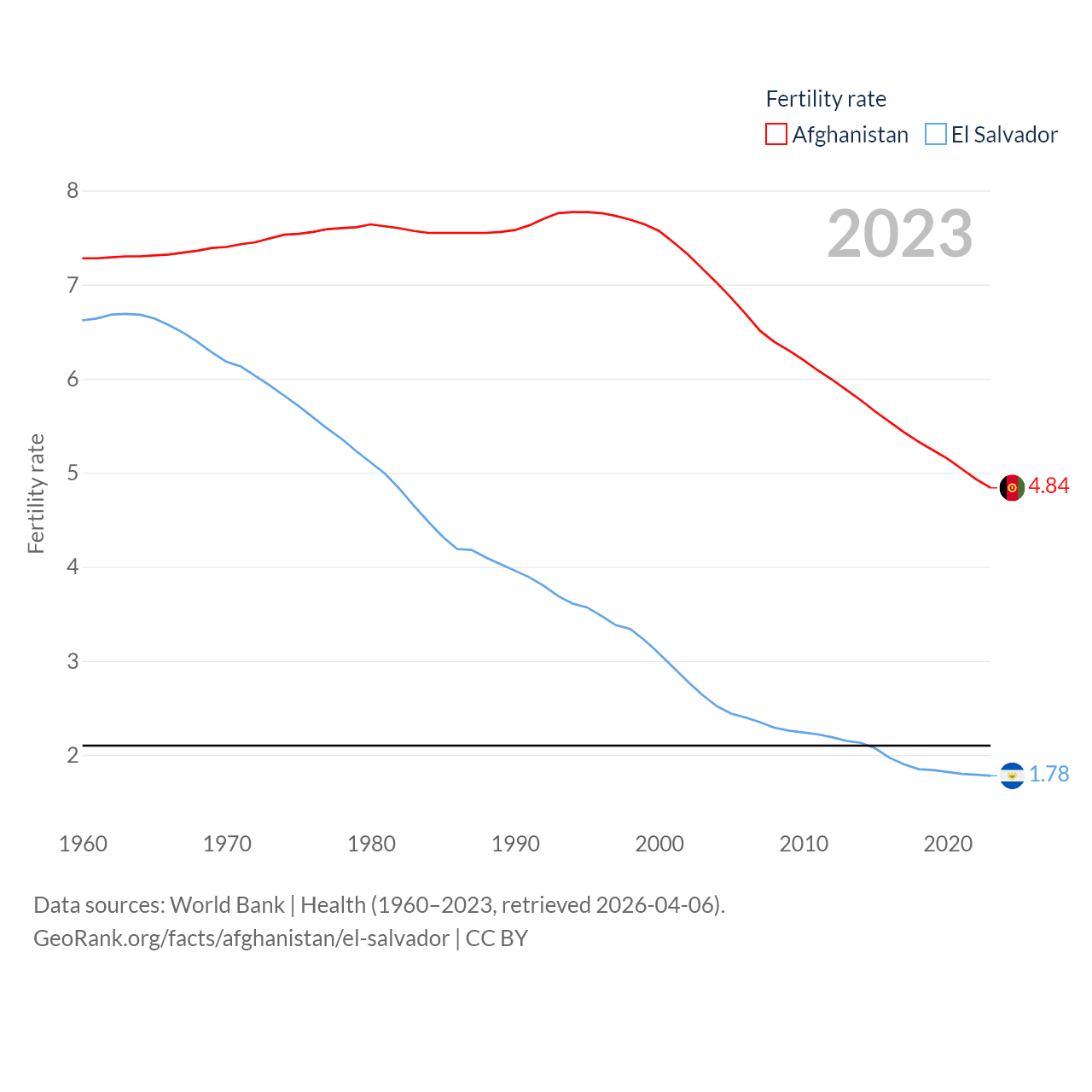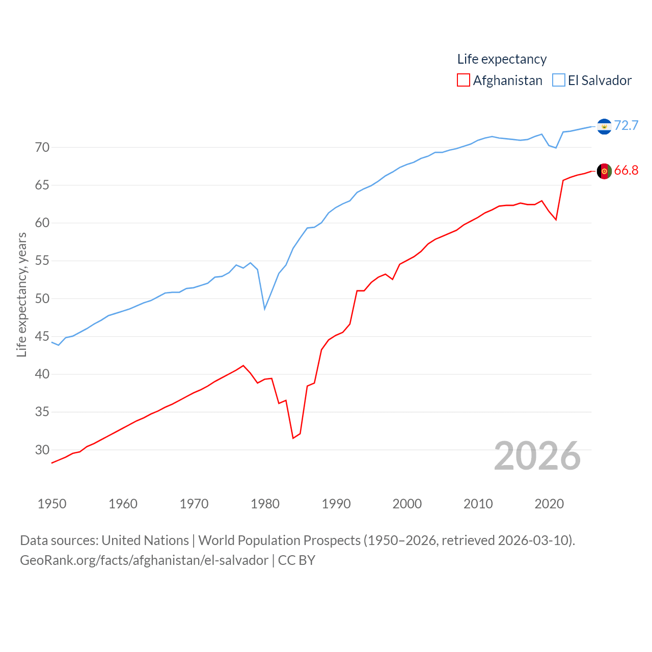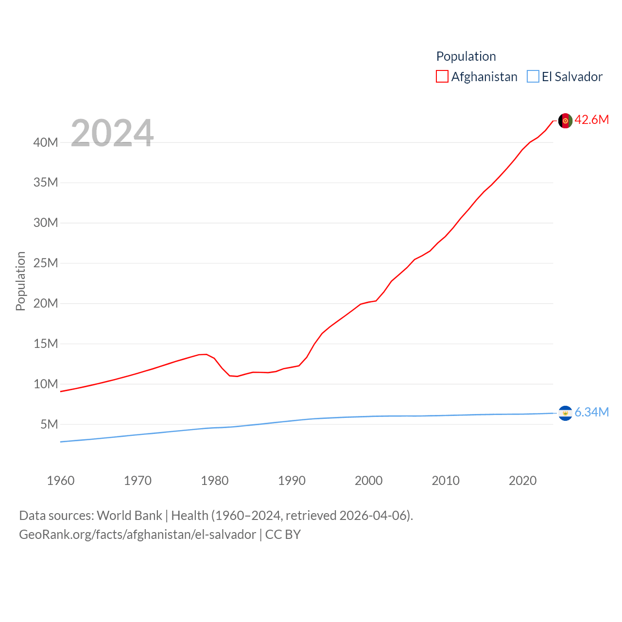 Afghanistan has a population of 42.6M (ranked 36/197), compared with 6.34M in El Salvador (ranked 111/197). Afghanistan's land area is 251,827 sq mi versus 8,000 sq mi for El Salvador (ranked 40th vs. 150th).