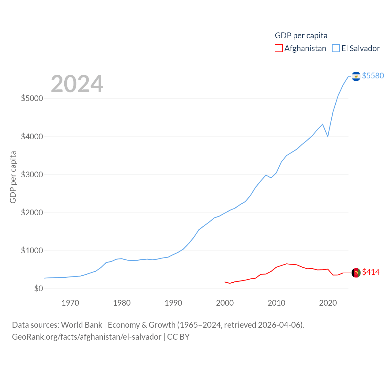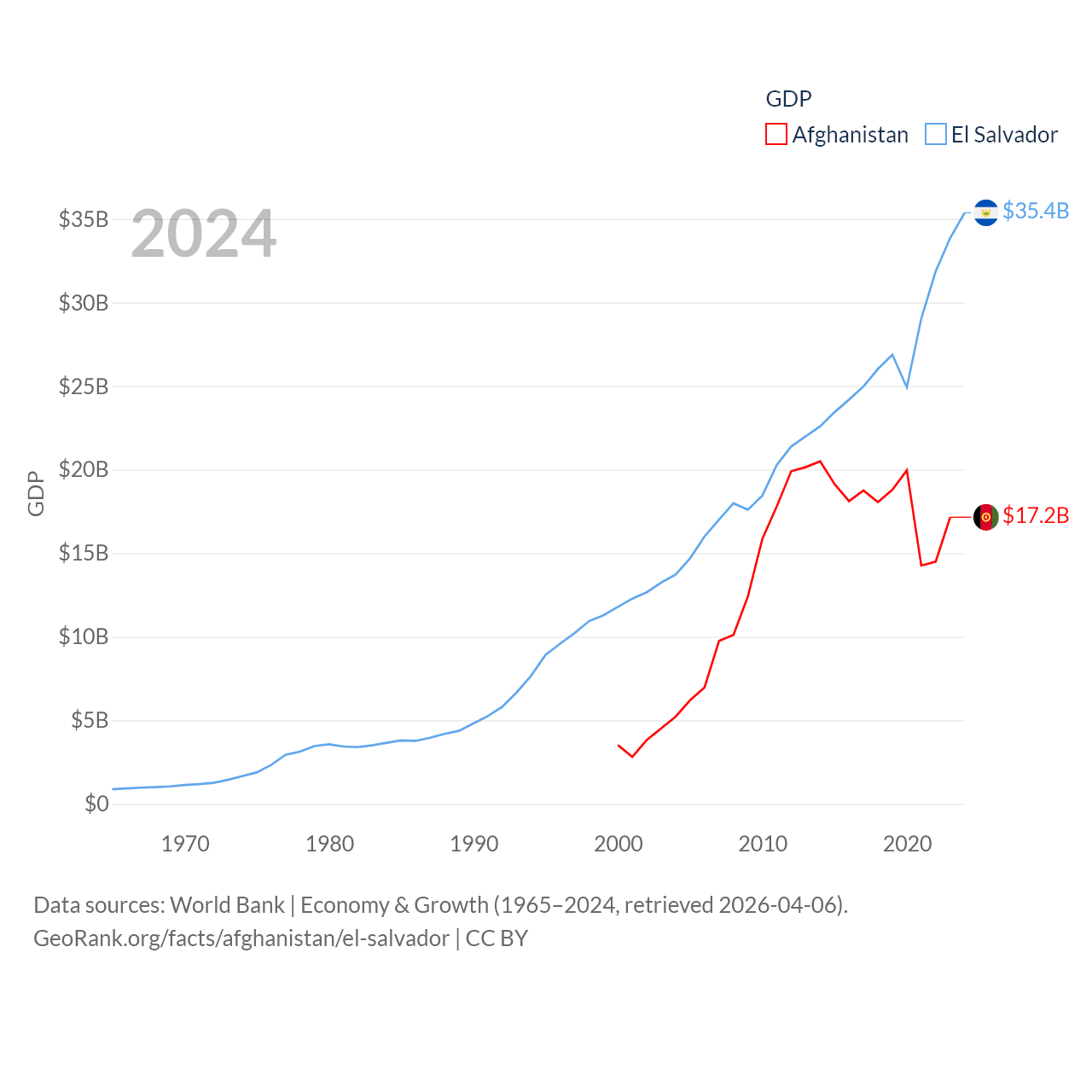 By GDP, Afghanistan ranks 137/197 ($17.2B) and El Salvador ranks 105/197 ($35.4B). By GDP per capita, Afghanistan ranks 196/197 ($414), while El Salvador ranks 116/197 ($5,580).