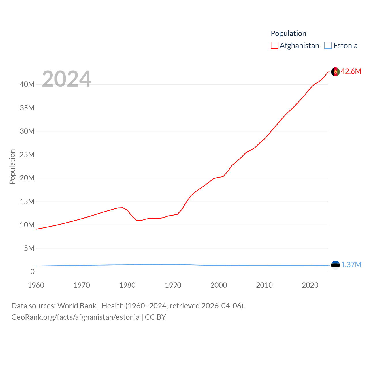 Afghanistan has a population of 42.6M (ranked 36/197), compared with 1.37M in Estonia (ranked 153/197). Afghanistan's land area is 251,827 sq mi versus 16,498 sq mi for Estonia (ranked 40th vs. 129th).