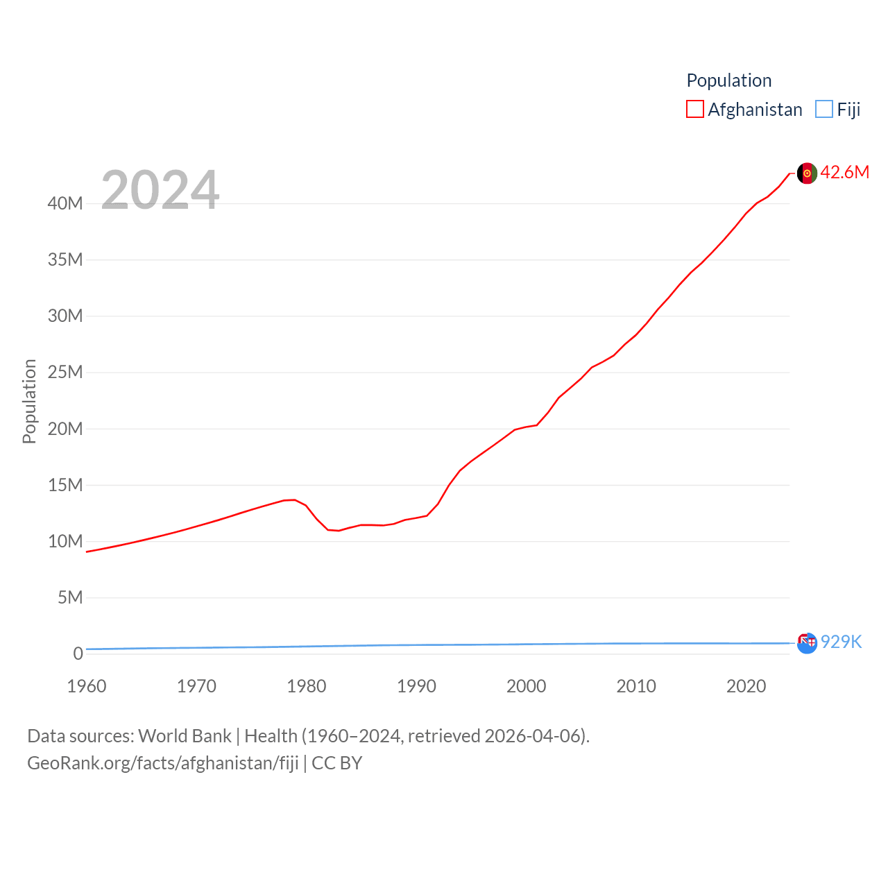 Afghanistan has a population of 42.6M (ranked 36/197), compared with 929K in Fiji (ranked 159/197). Afghanistan's land area is 251,827 sq mi versus 7,054 sq mi for Fiji (ranked 40th vs. 152nd).