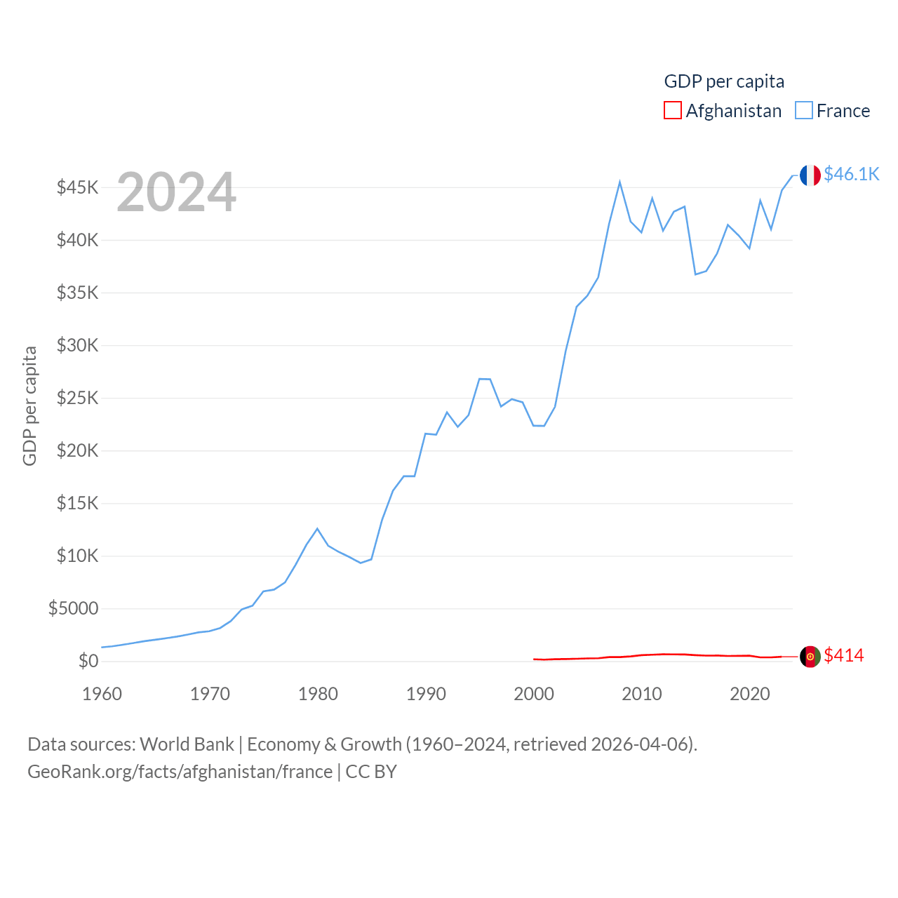 By GDP, Afghanistan ranks 137/197 ($17.2B) and France ranks 7/197 ($3.16T). By GDP per capita, Afghanistan ranks 196/197 ($414), while France ranks 27/197 ($46,103).