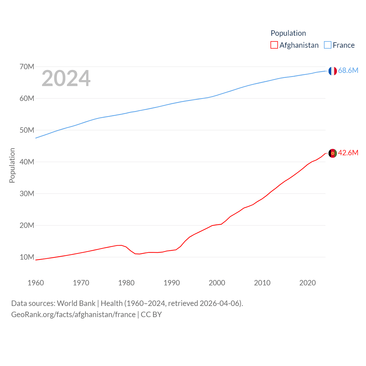 Afghanistan has a population of 42.6M (ranked 36/197), compared with 68.6M in France (ranked 23/197). Afghanistan's land area is 251,827 sq mi versus 208,090 sq mi for France (ranked 40th vs. 48th).