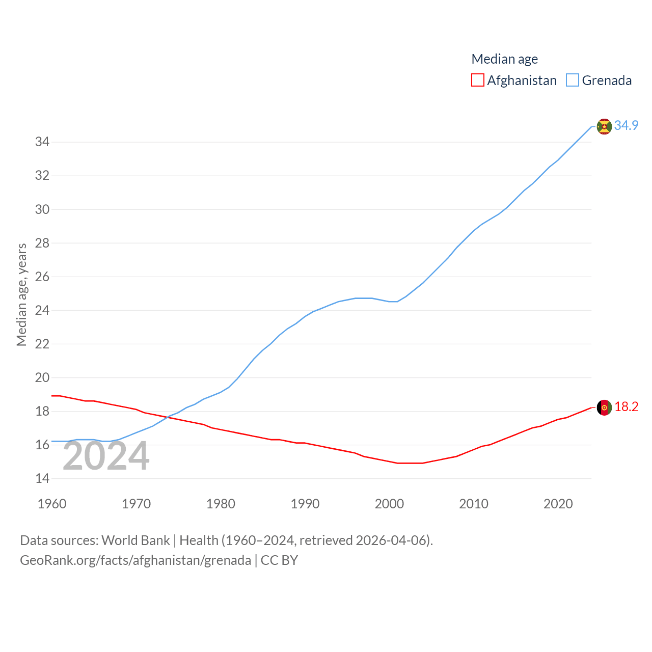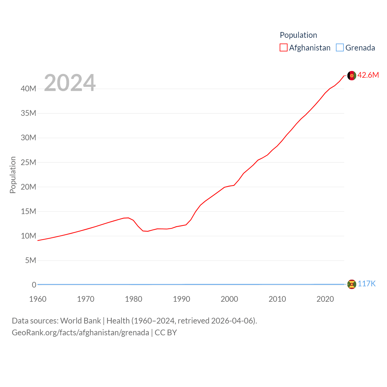 Afghanistan has a population of 42.6M (ranked 36/197), compared with 117K in Grenada (ranked 182/197). Afghanistan's land area is 251,827 sq mi versus 131.3 sq mi for Grenada (ranked 40th vs. 186th).