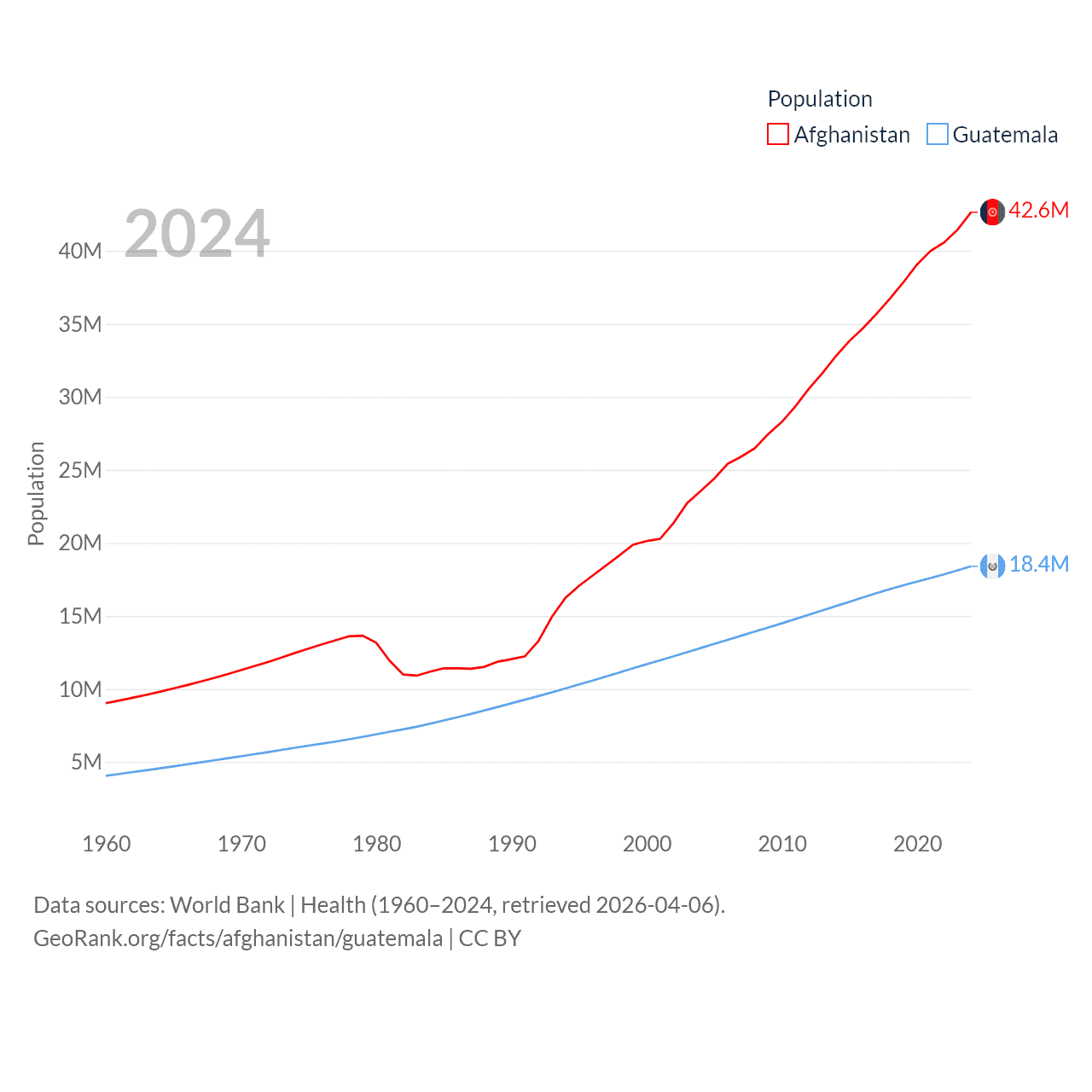 Afghanistan has a population of 42.6M (ranked 36/197), compared with 18.4M in Guatemala (ranked 70/197). Afghanistan's land area is 251,827 sq mi versus 41,375 sq mi for Guatemala (ranked 40th vs. 102nd).