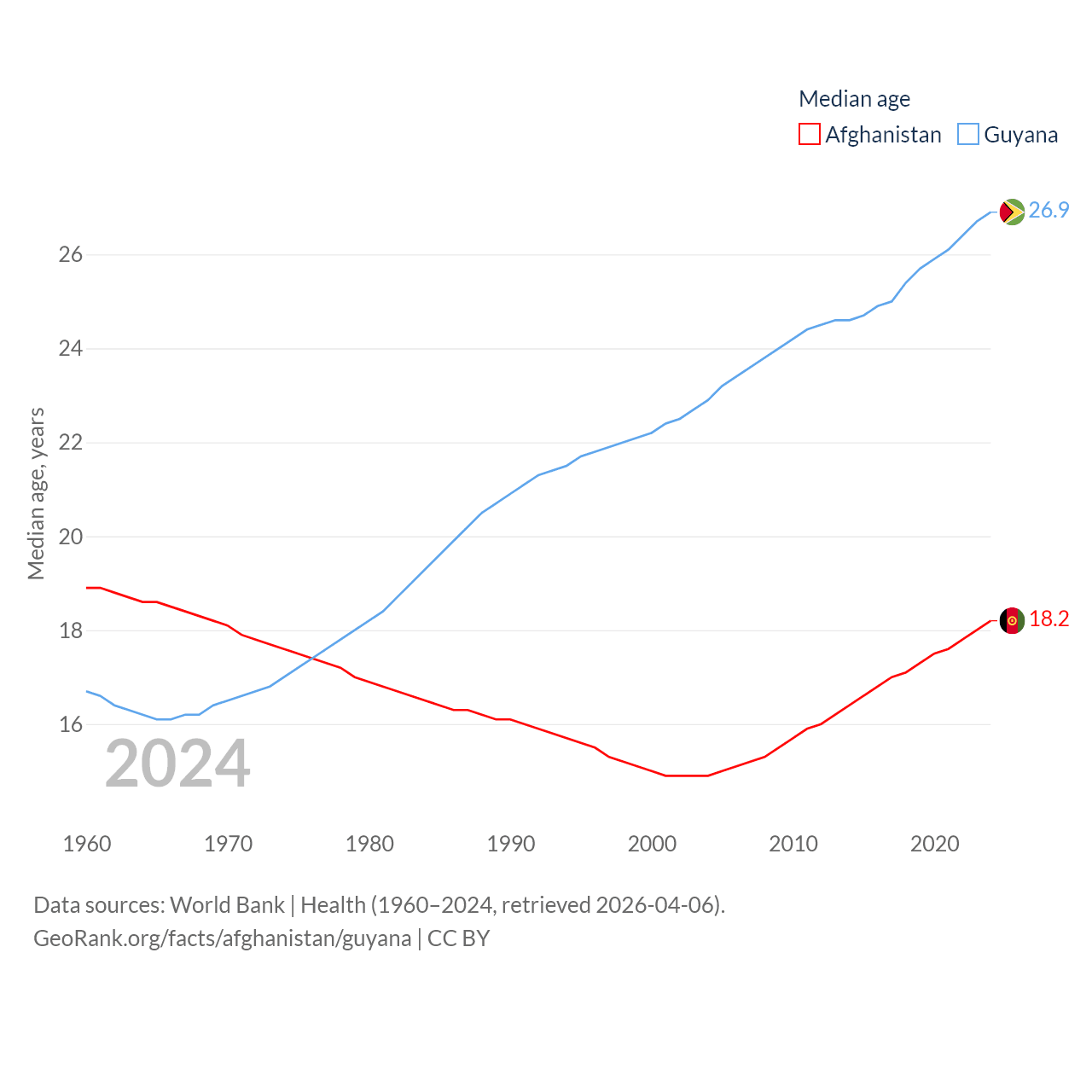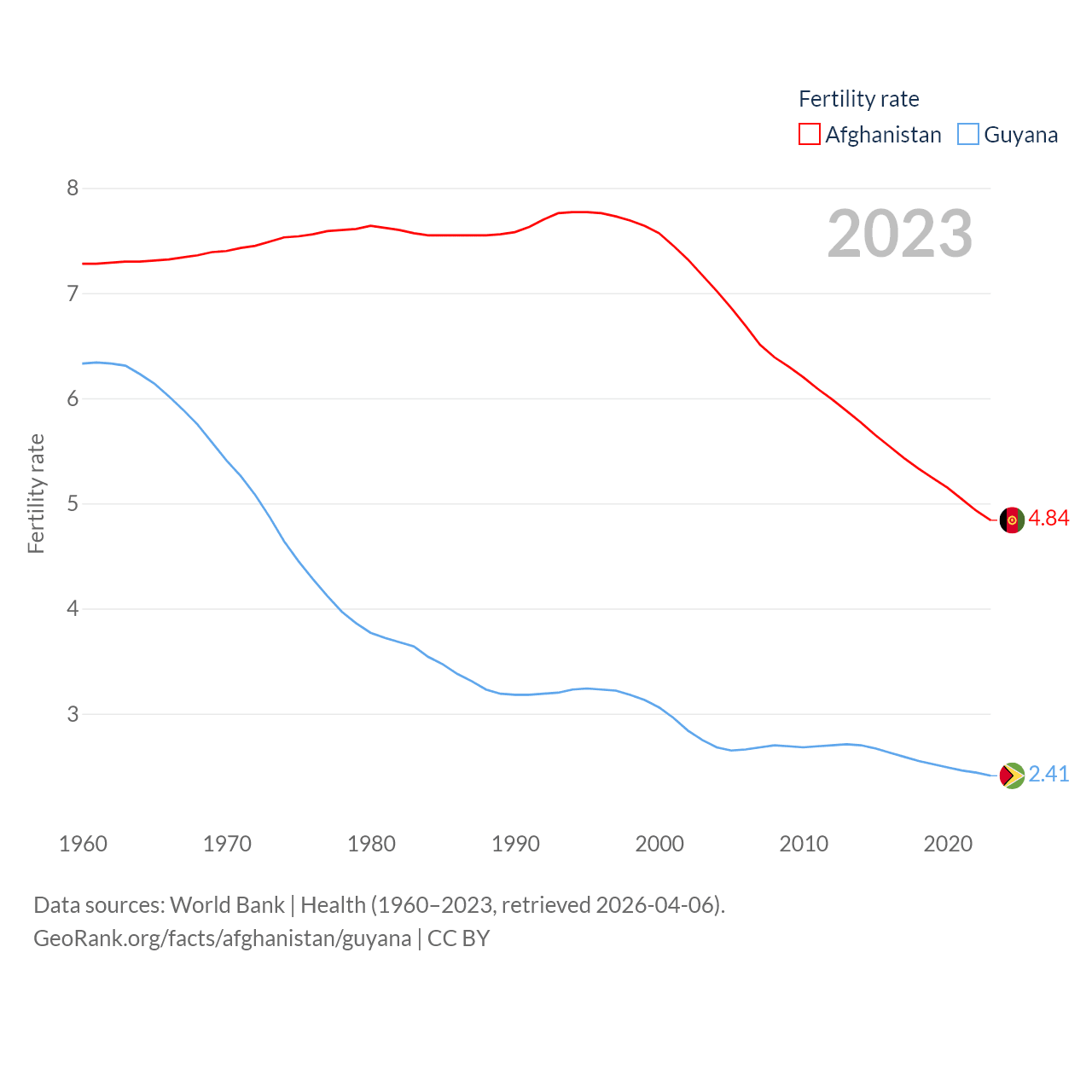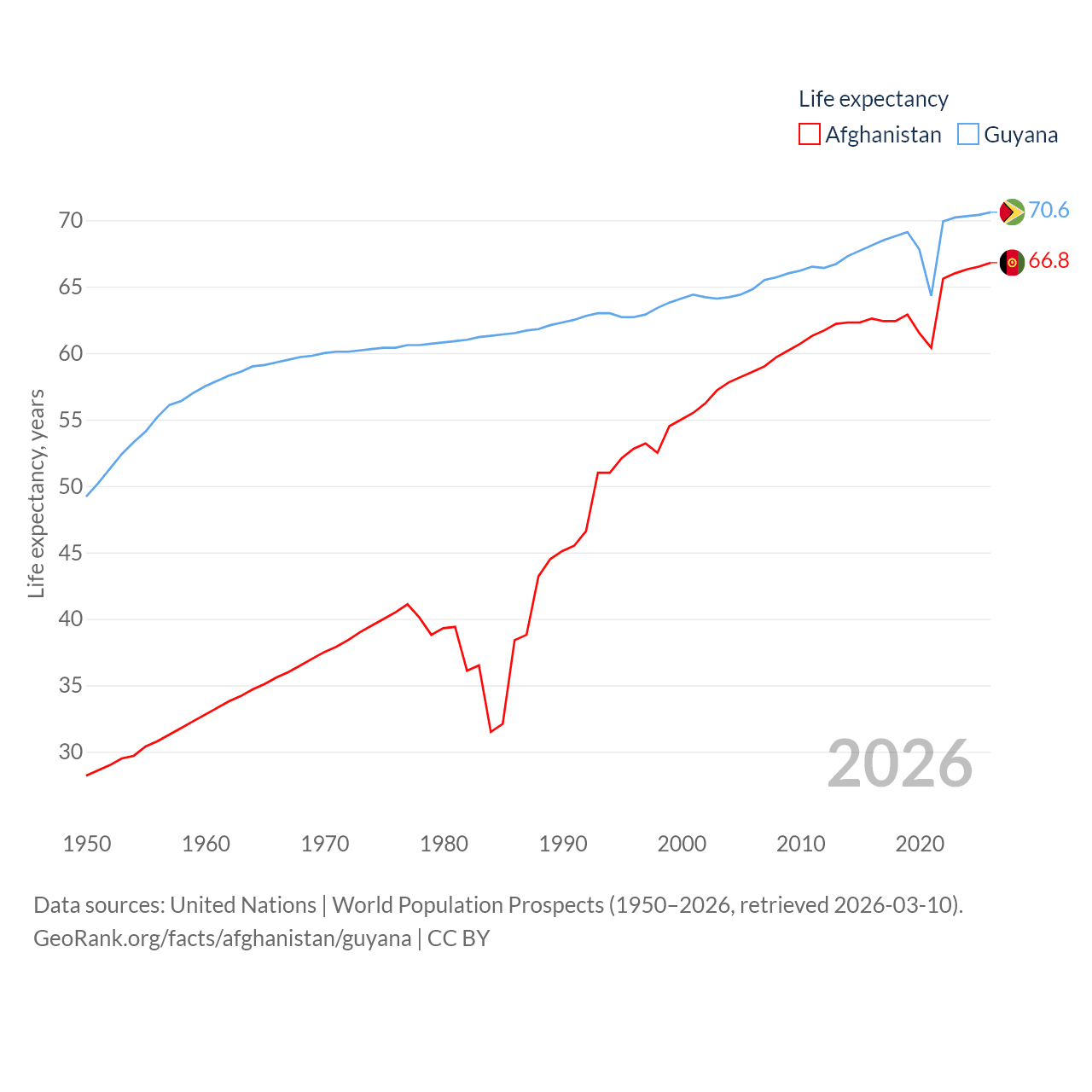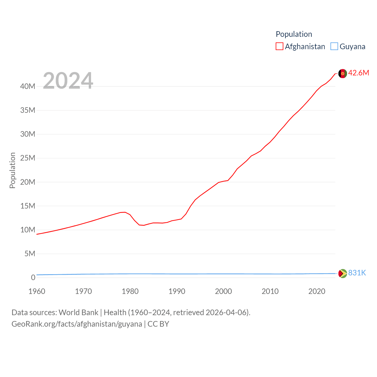 Afghanistan has a population of 42.6M (ranked 36/197), compared with 831K in Guyana (ranked 161/197). Afghanistan's land area is 251,827 sq mi versus 81,522 sq mi for Guyana (ranked 40th vs. 82nd).