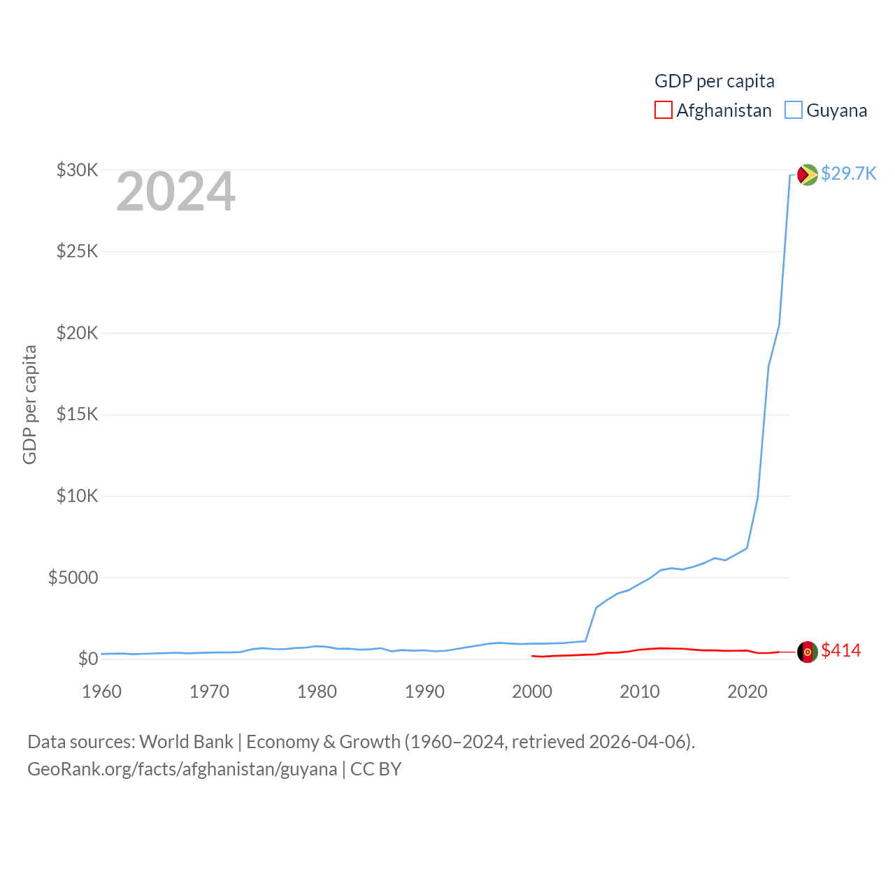By GDP, Afghanistan ranks 137/197 ($17.2B) and Guyana ranks 120/197 ($24.7B). By GDP per capita, Afghanistan ranks 196/197 ($414), while Guyana ranks 41/197 ($29,675).