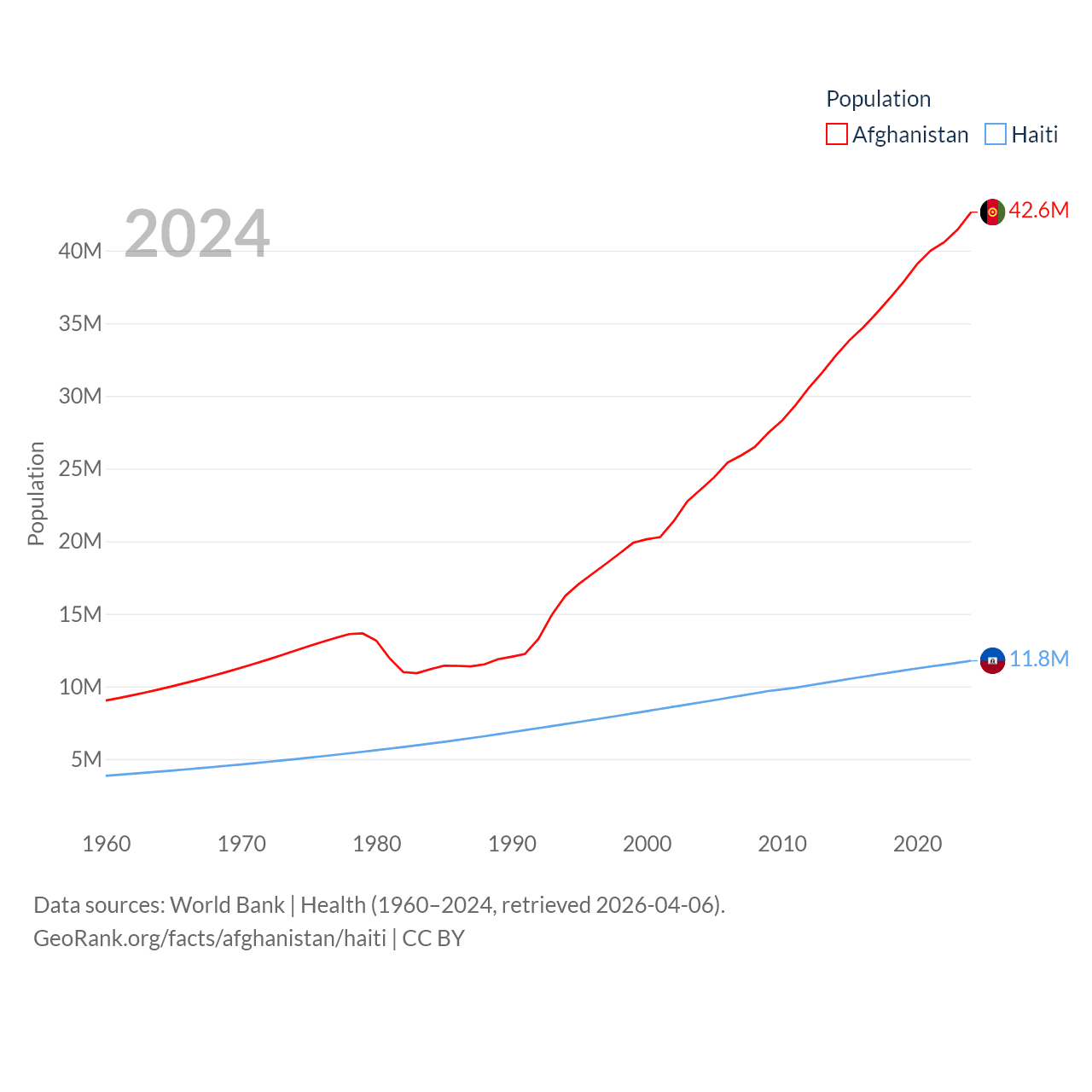 Afghanistan has a population of 42.6M (ranked 36/197), compared with 11.8M in Haiti (ranked 83/197). Afghanistan's land area is 251,827 sq mi versus 10,641 sq mi for Haiti (ranked 40th vs. 142nd).
