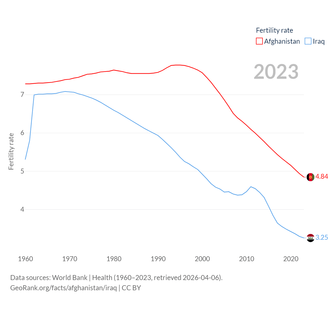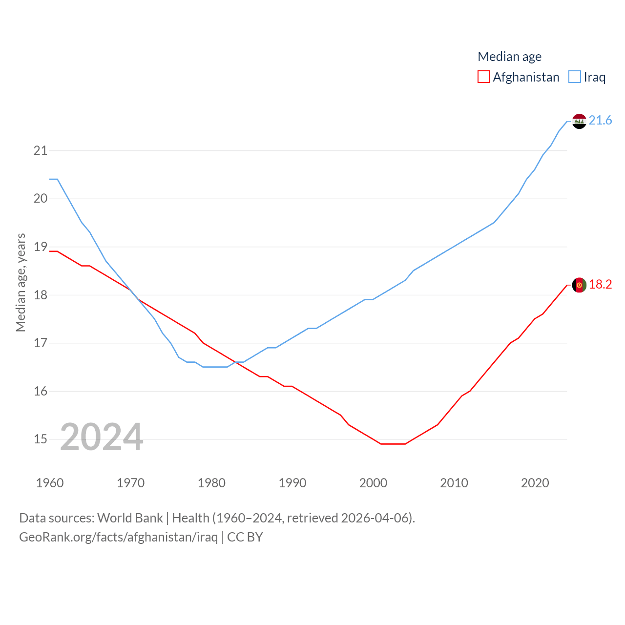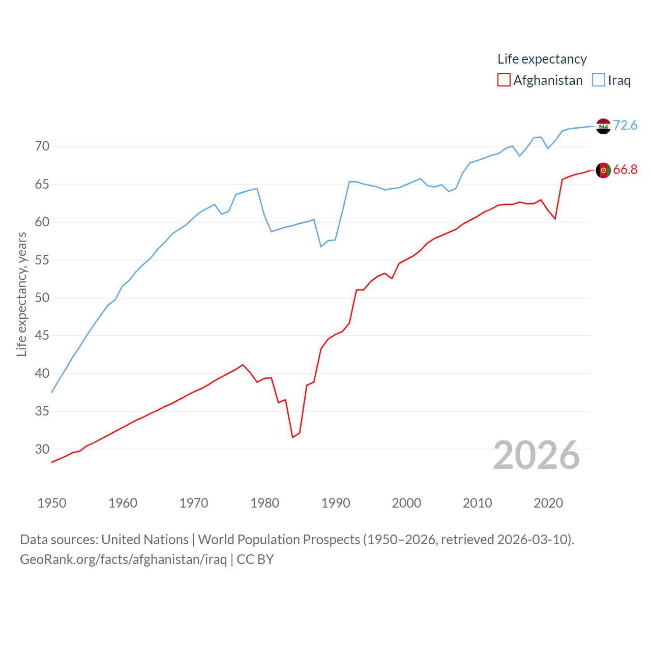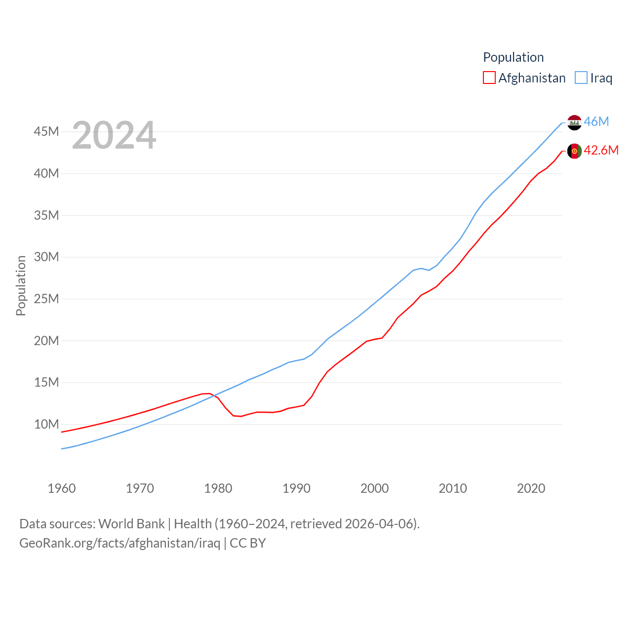 Afghanistan has a population of 42.6M (ranked 36/197), compared with 46M in Iraq (ranked 34/197). Afghanistan's land area is 251,827 sq mi versus 167,619 sq mi for Iraq (ranked 40th vs. 57th).