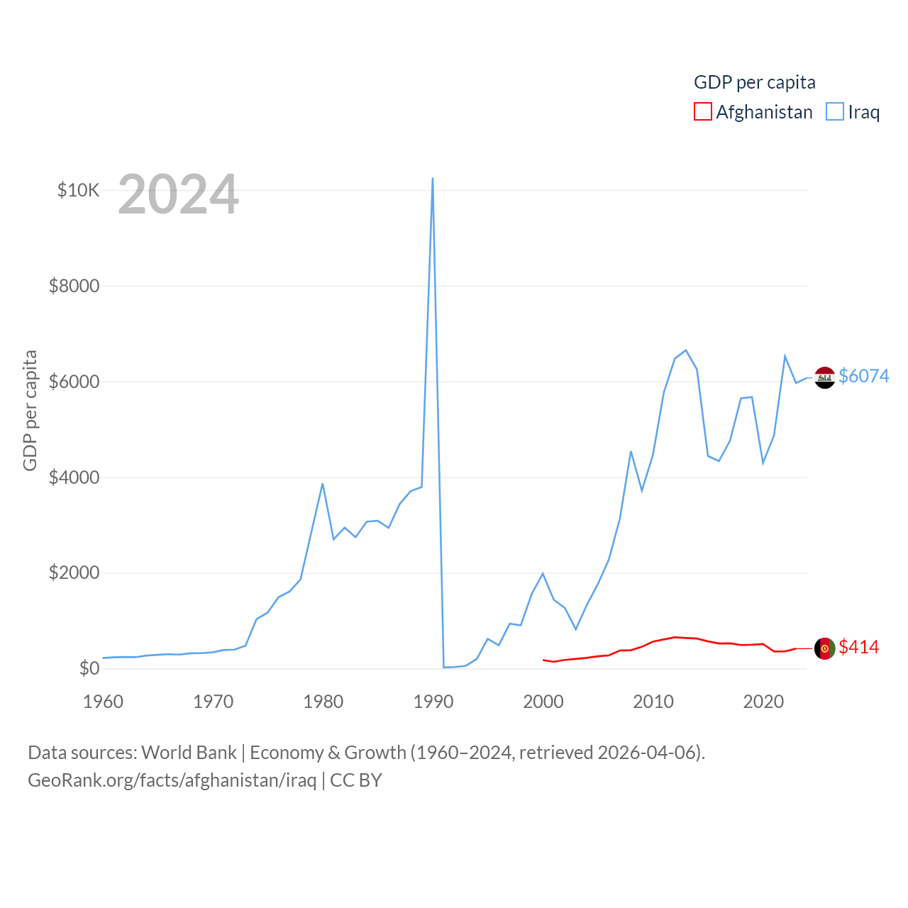 By GDP, Afghanistan ranks 137/197 ($17.2B) and Iraq ranks 50/197 ($280B). By GDP per capita, Afghanistan ranks 196/197 ($414), while Iraq ranks 113/197 ($6,074).