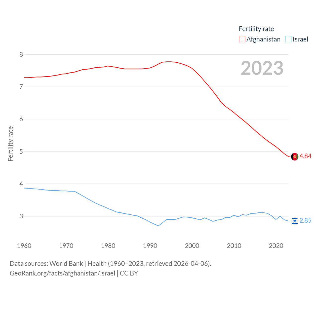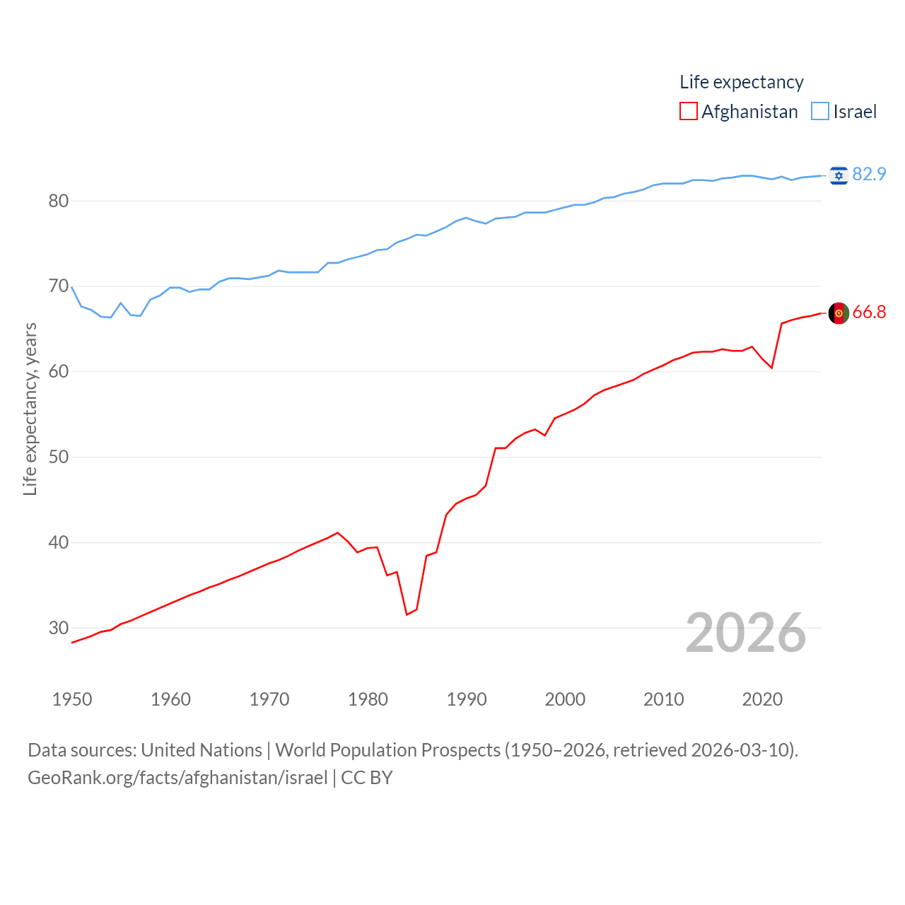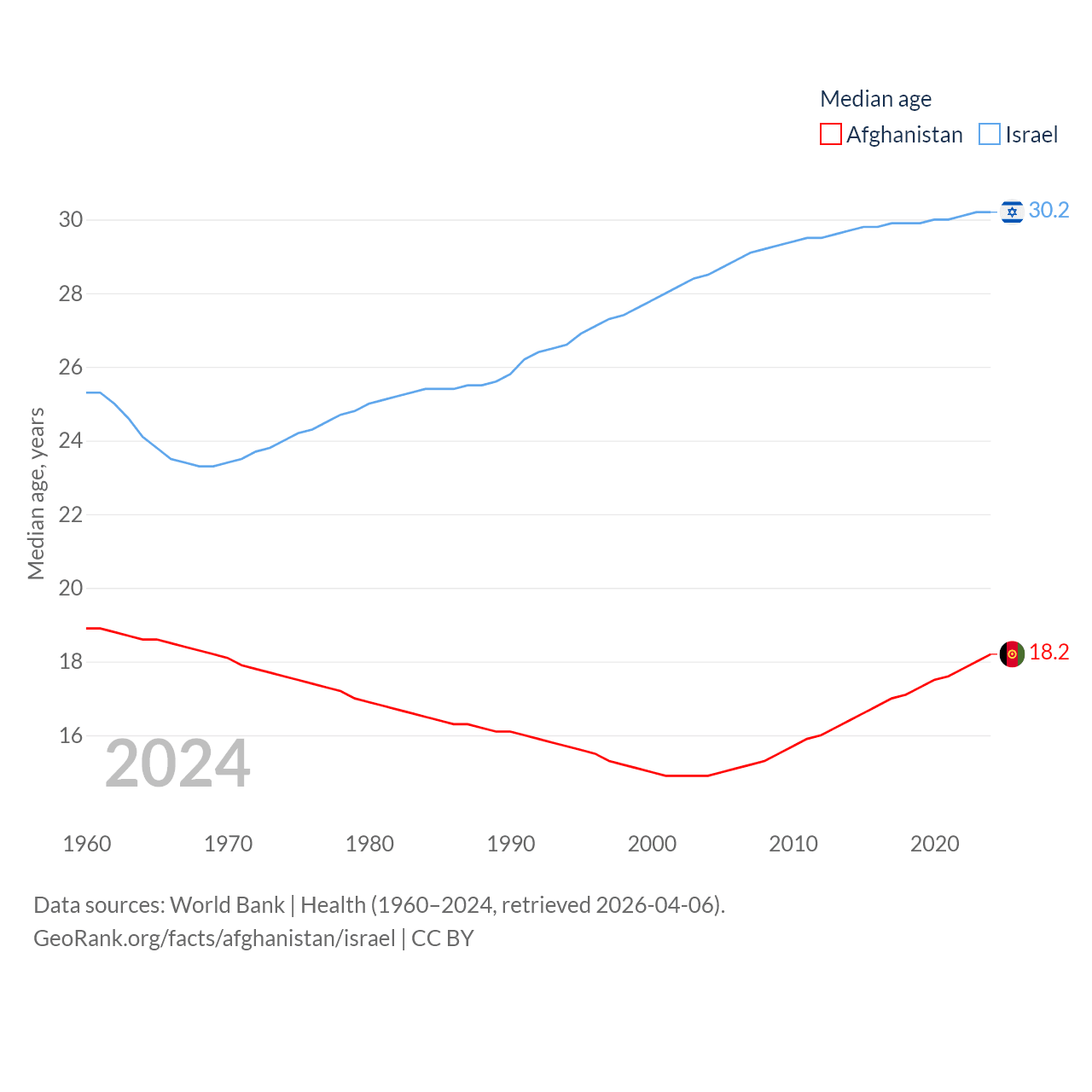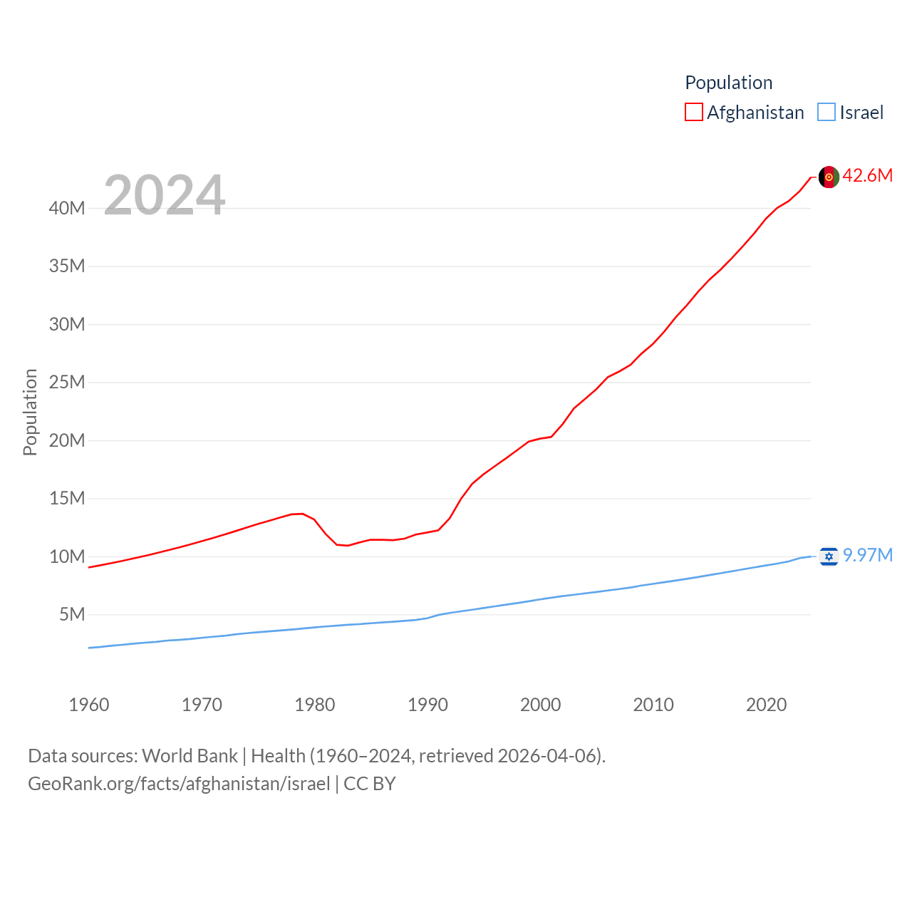 Afghanistan has a population of 42.6M (ranked 36/197), compared with 9.97M in Israel (ranked 96/197). Afghanistan's land area is 251,827 sq mi versus 8,355 sq mi for Israel (ranked 40th vs. 149th).