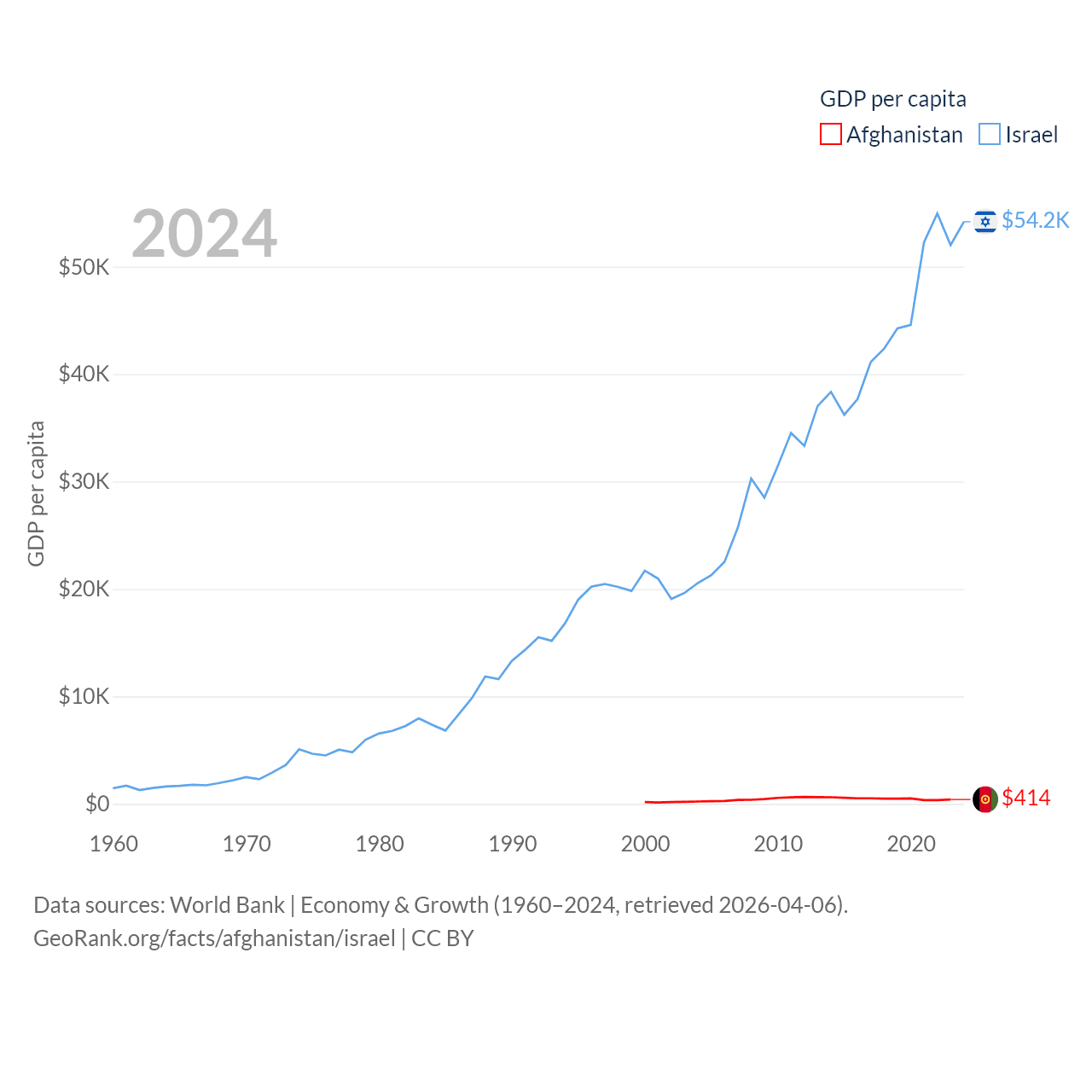 By GDP, Afghanistan ranks 137/197 ($17.2B) and Israel ranks 29/197 ($540B). By GDP per capita, Afghanistan ranks 196/197 ($414), while Israel ranks 21/197 ($54,177).