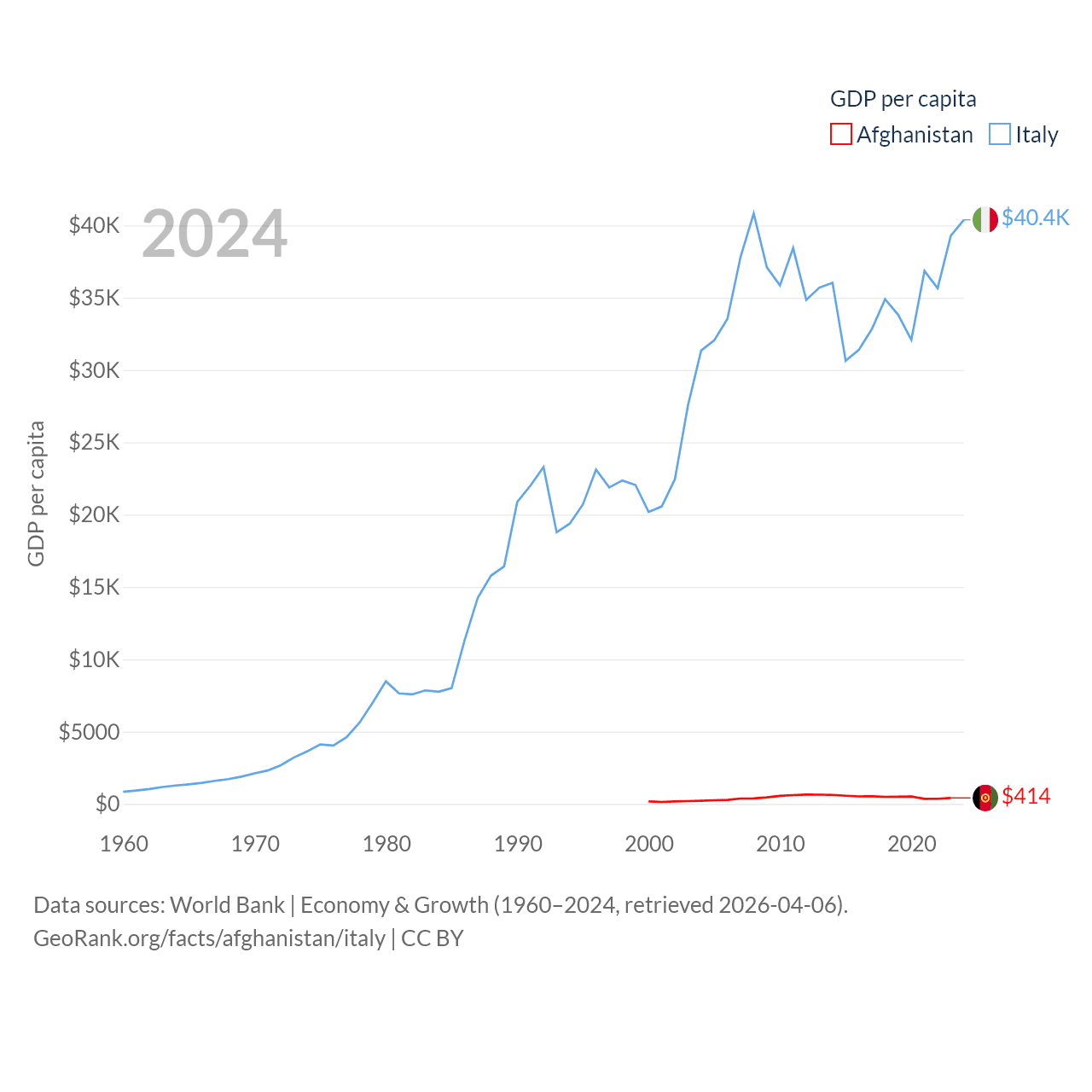 By GDP, Afghanistan ranks 137/197 ($17.2B) and Italy ranks 8/197 ($2.38T). By GDP per capita, Afghanistan ranks 196/197 ($414), while Italy ranks 29/197 ($40,385).