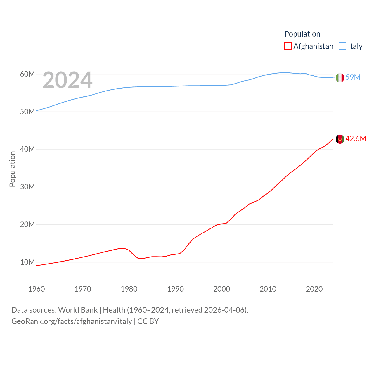 Afghanistan has a population of 42.6M (ranked 36/197), compared with 59M in Italy (ranked 25/197). Afghanistan's land area is 251,827 sq mi versus 114,178 sq mi for Italy (ranked 40th vs. 72nd).