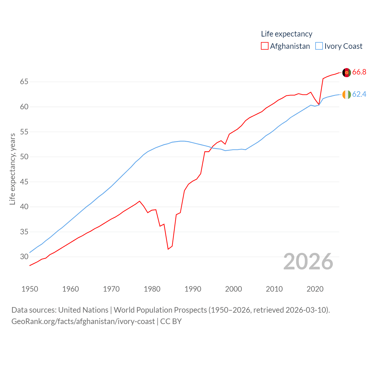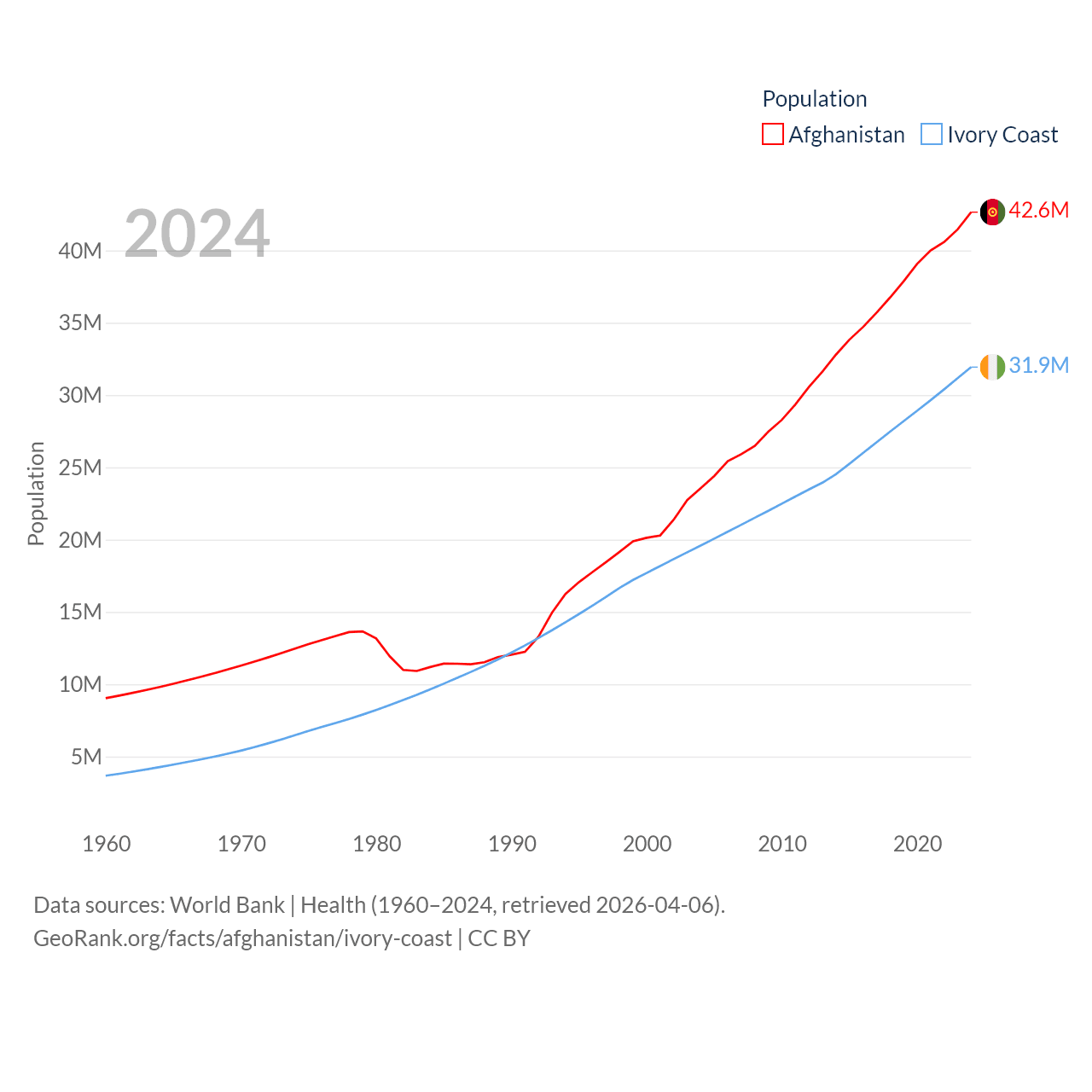 Afghanistan has a population of 42.6M (ranked 36/197), compared with 31.9M in Ivory Coast (ranked 50/197). Afghanistan's land area is 251,827 sq mi versus 122,780 sq mi for Ivory Coast (ranked 40th vs. 66th).