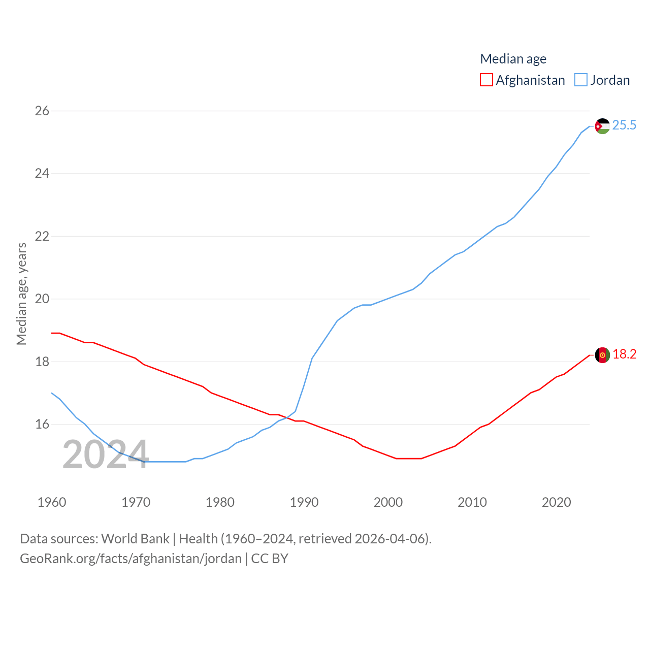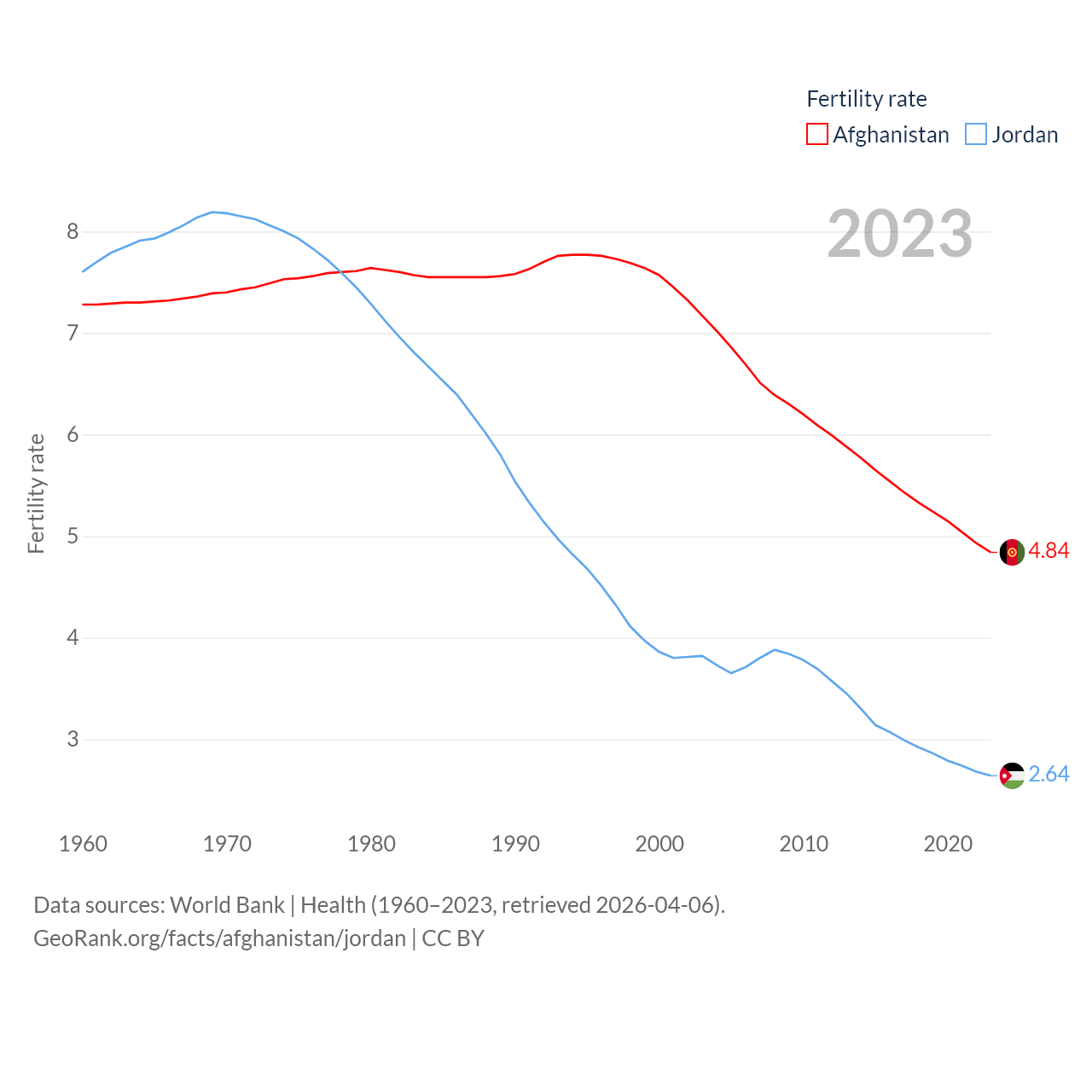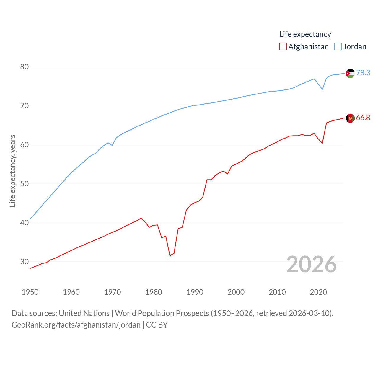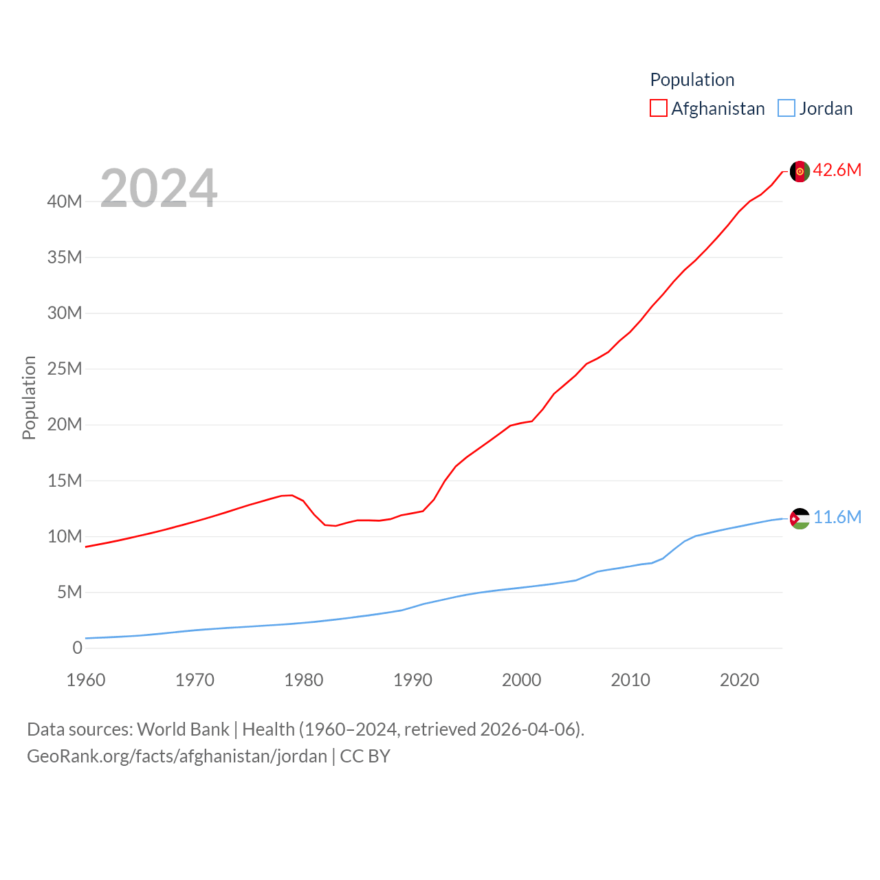 Afghanistan has a population of 42.6M (ranked 36/197), compared with 11.6M in Jordan (ranked 84/197). Afghanistan's land area is 251,827 sq mi versus 34,284 sq mi for Jordan (ranked 40th vs. 110th).