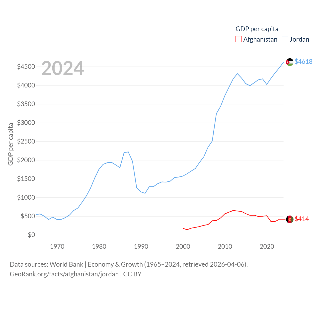 By GDP, Afghanistan ranks 137/197 ($17.2B) and Jordan ranks 90/197 ($53.4B). By GDP per capita, Afghanistan ranks 196/197 ($414), while Jordan ranks 123/197 ($4,618).