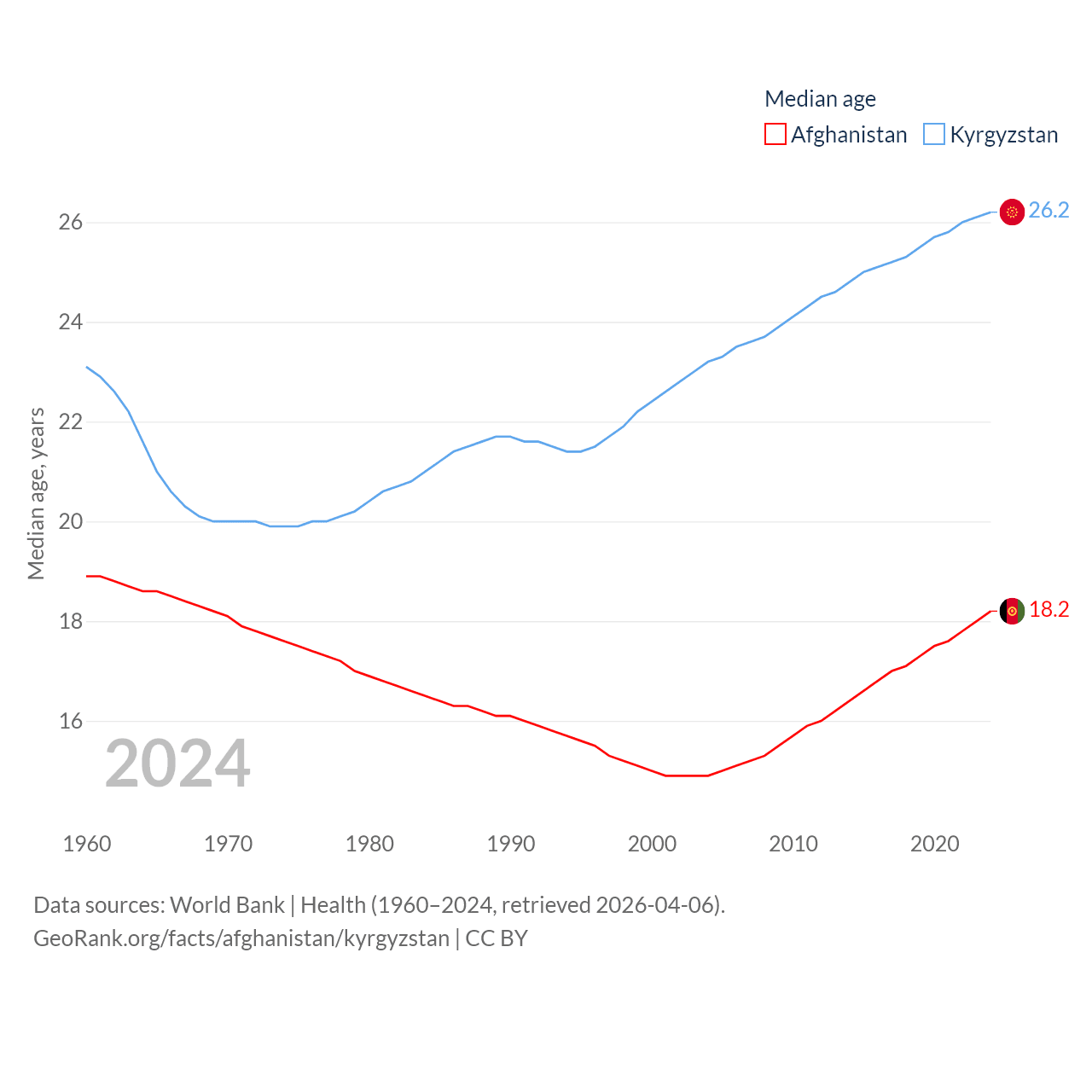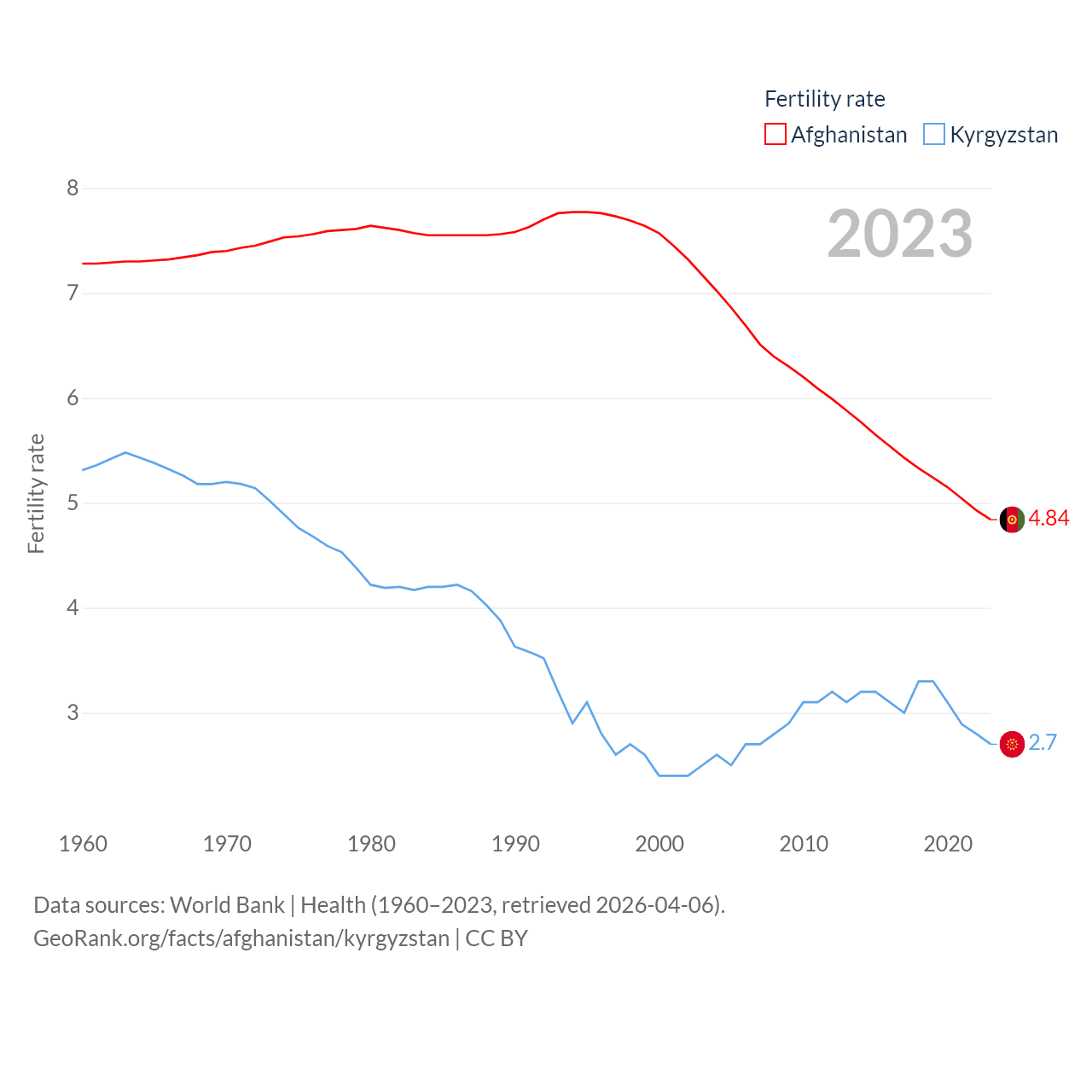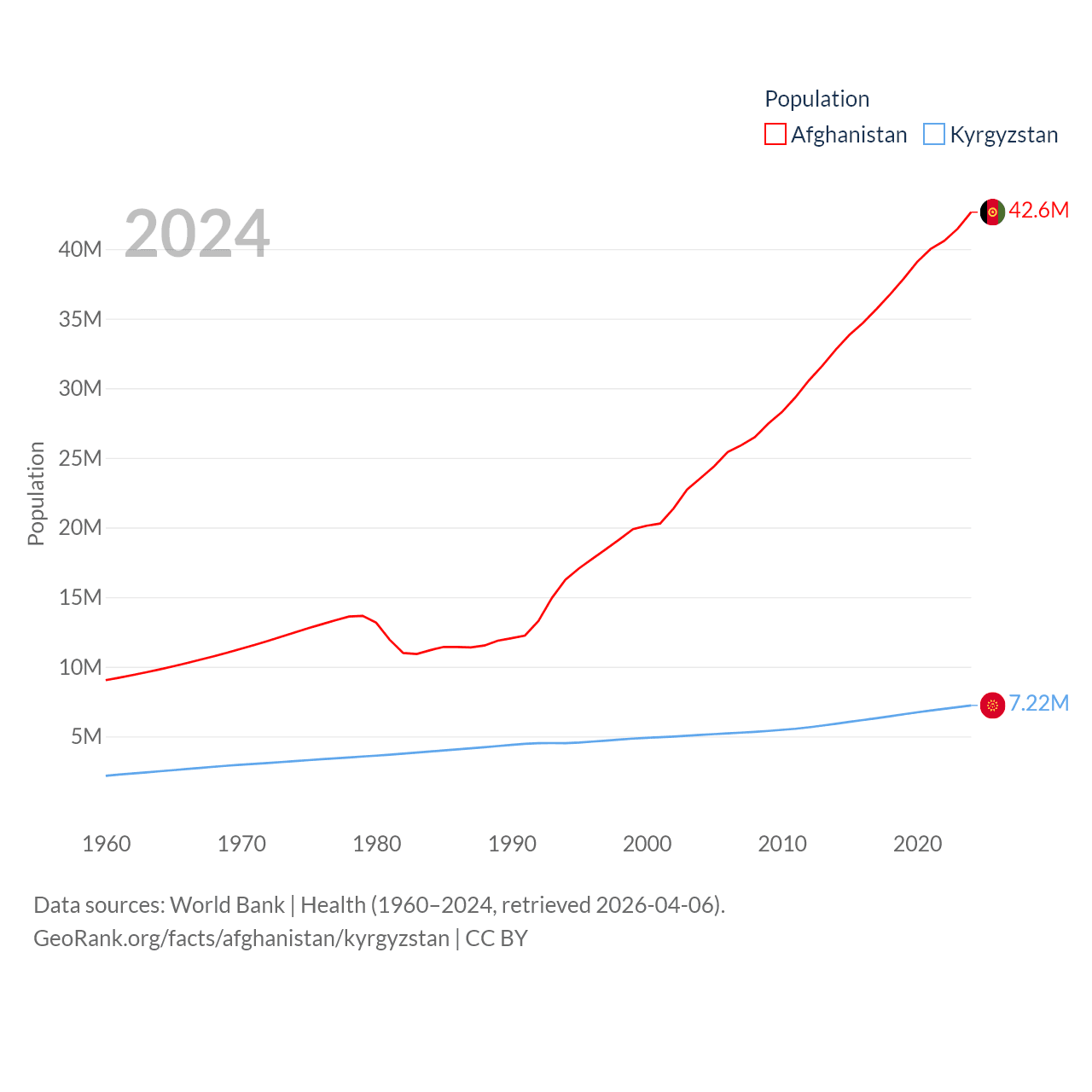 Afghanistan has a population of 42.6M (ranked 36/197), compared with 7.22M in Kyrgyzstan (ranked 106/197). Afghanistan's land area is 251,827 sq mi versus 74,054 sq mi for Kyrgyzstan (ranked 40th vs. 86th).