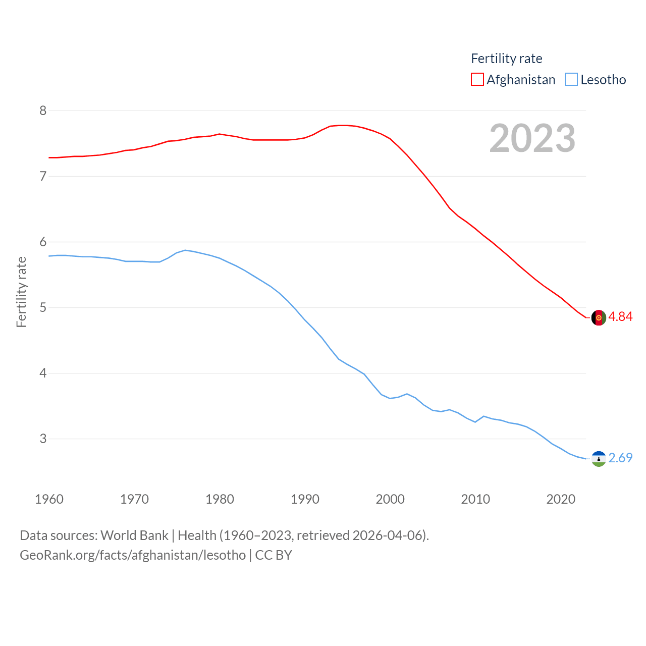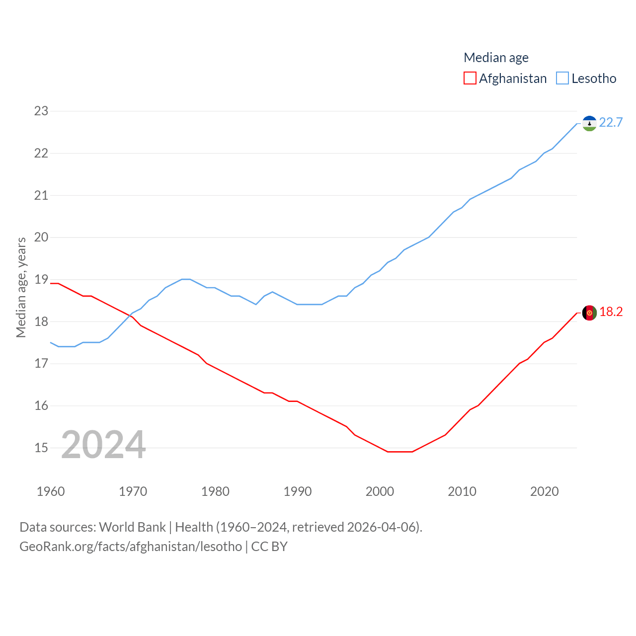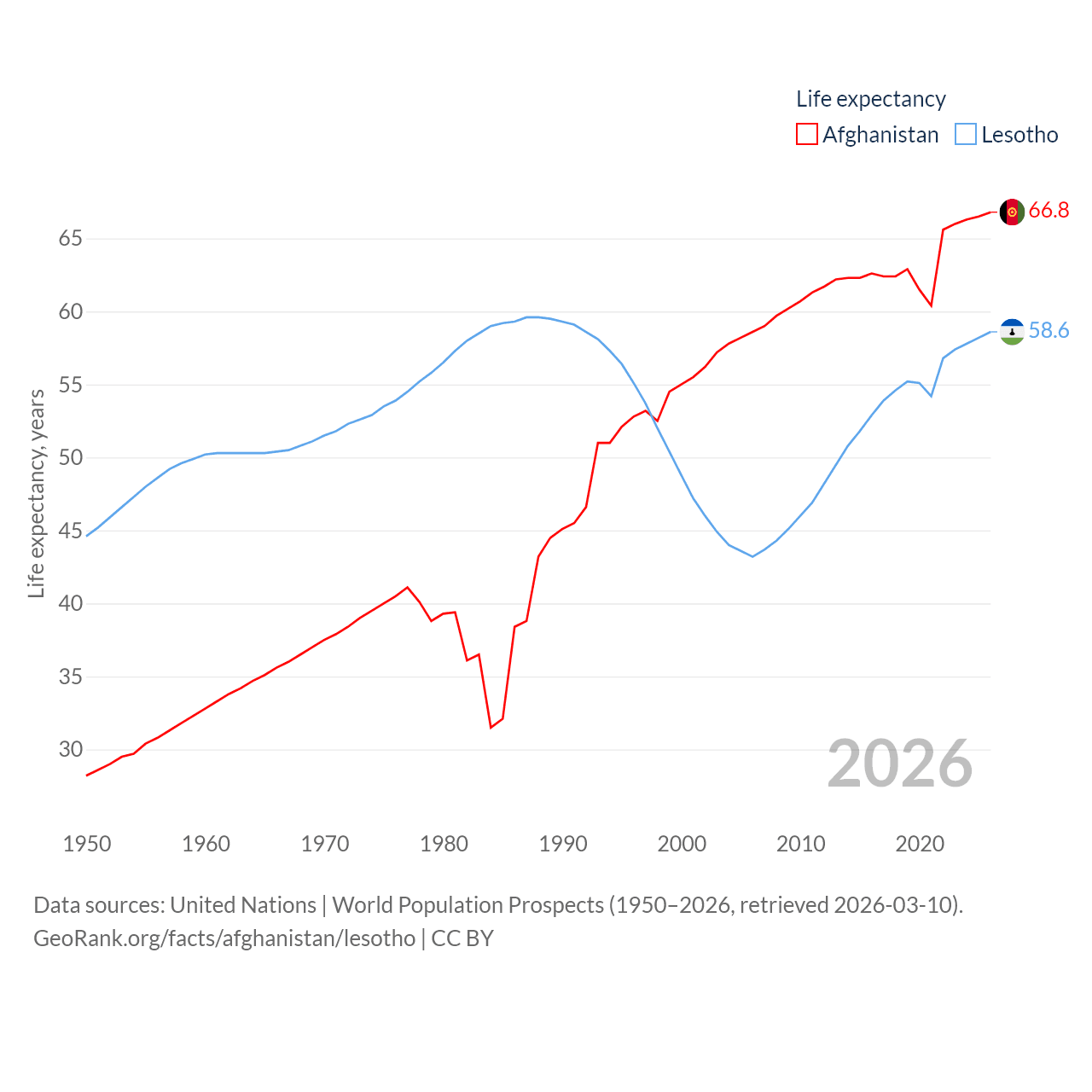 Afghanistan has a population of 42.6M (ranked 36/197), compared with 2.34M in Lesotho (ranked 145/197). Afghanistan's land area is 251,827 sq mi versus 11,722 sq mi for Lesotho (ranked 40th vs. 137th).