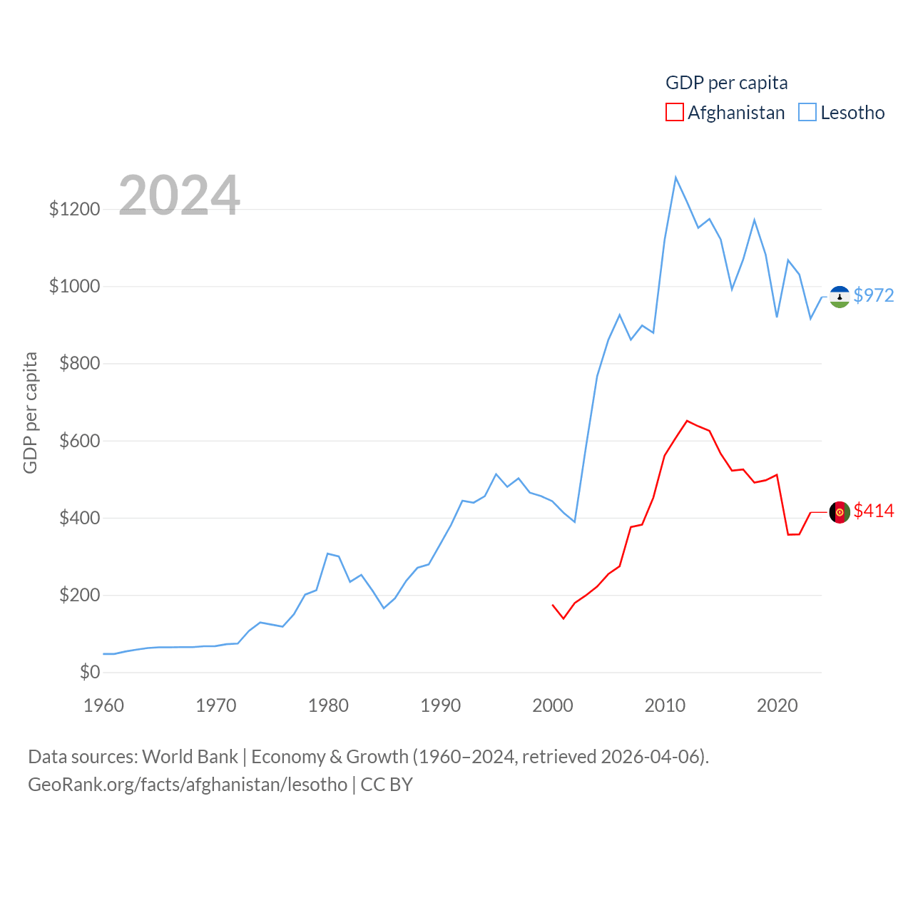By GDP, Afghanistan ranks 137/197 ($17.2B) and Lesotho ranks 175/197 ($2.27B). By GDP per capita, Afghanistan ranks 196/197 ($414), while Lesotho ranks 181/197 ($972).