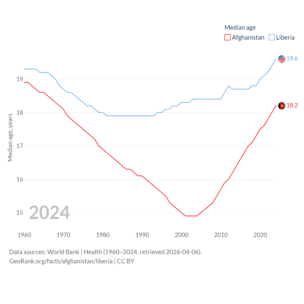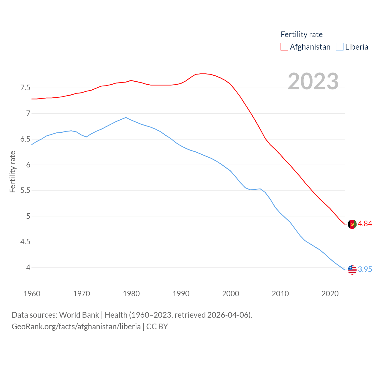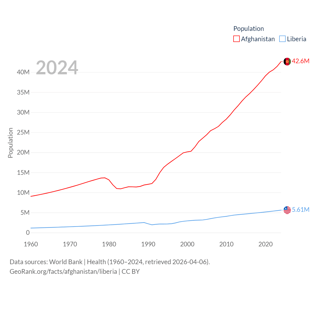 Afghanistan has a population of 42.6M (ranked 36/197), compared with 5.61M in Liberia (ranked 117/197). Afghanistan's land area is 251,827 sq mi versus 37,189 sq mi for Liberia (ranked 40th vs. 106th).