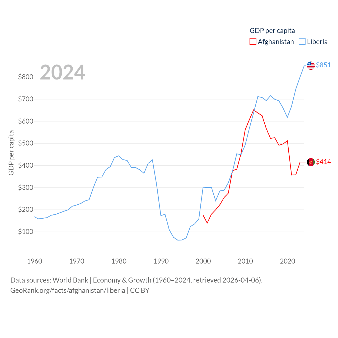 By GDP, Afghanistan ranks 137/197 ($17.2B) and Liberia ranks 163/197 ($4.78B). By GDP per capita, Afghanistan ranks 196/197 ($414), while Liberia ranks 184/197 ($851).