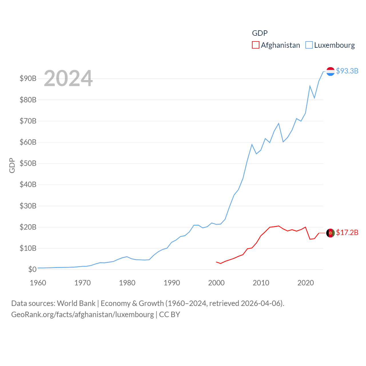 By GDP, Afghanistan ranks 137/197 ($17.2B) and Luxembourg ranks 74/197 ($93.3B). By GDP per capita, Afghanistan ranks 196/197 ($414), while Luxembourg ranks 3/197 ($137,782).
