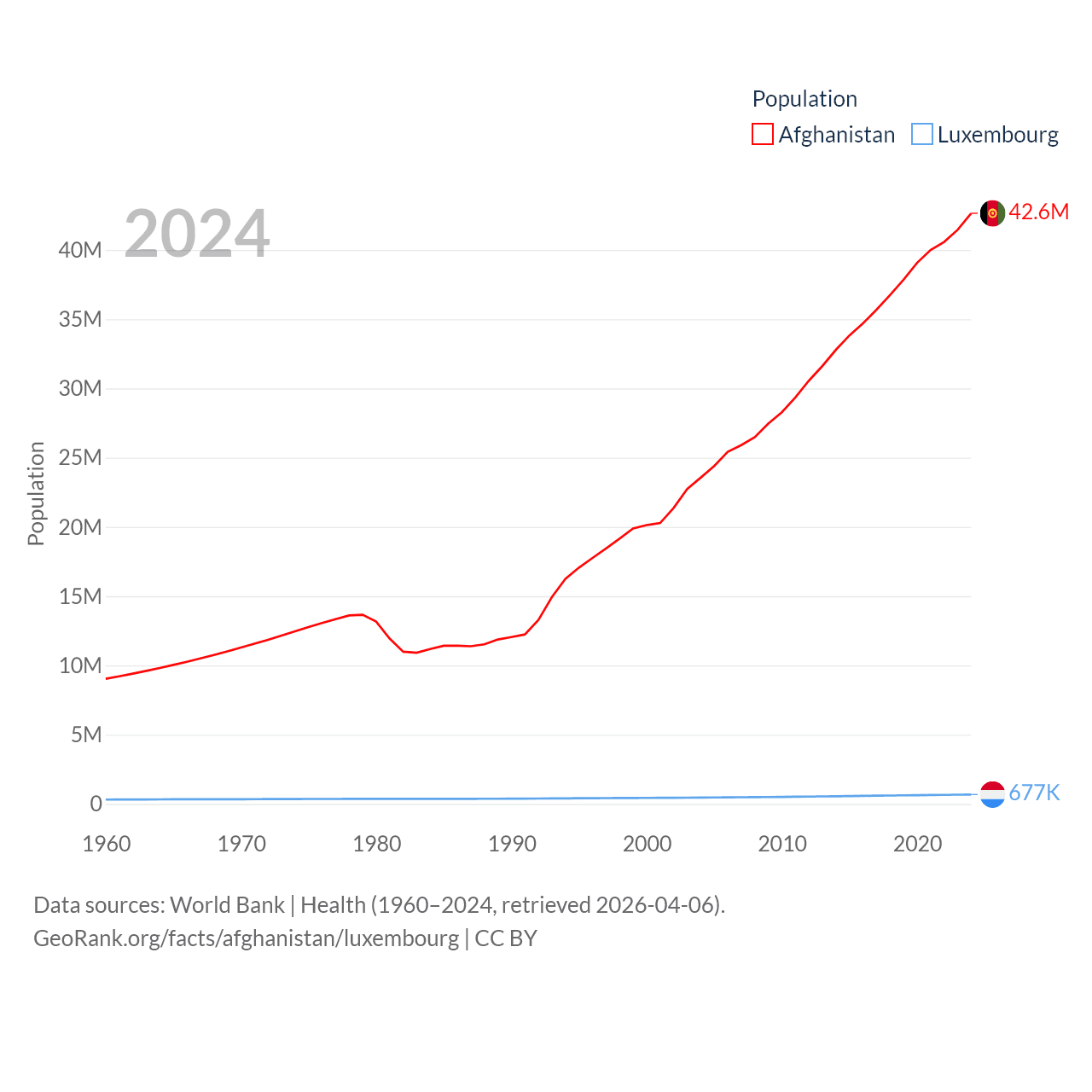 Afghanistan has a population of 42.6M (ranked 36/197), compared with 677K in Luxembourg (ranked 164/197). Afghanistan's land area is 251,827 sq mi versus 994 sq mi for Luxembourg (ranked 40th vs. 169th).