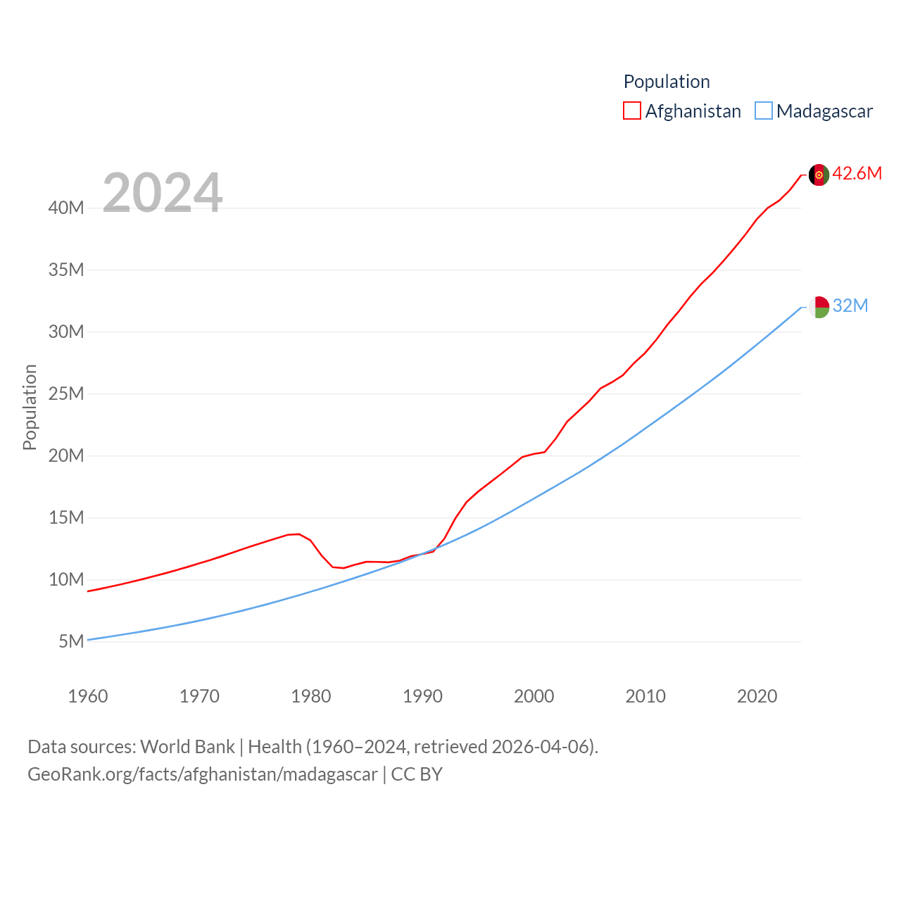 Afghanistan has a population of 42.6M (ranked 36/197), compared with 32M in Madagascar (ranked 49/197). Afghanistan's land area is 251,827 sq mi versus 224,634 sq mi for Madagascar (ranked 40th vs. 44th).