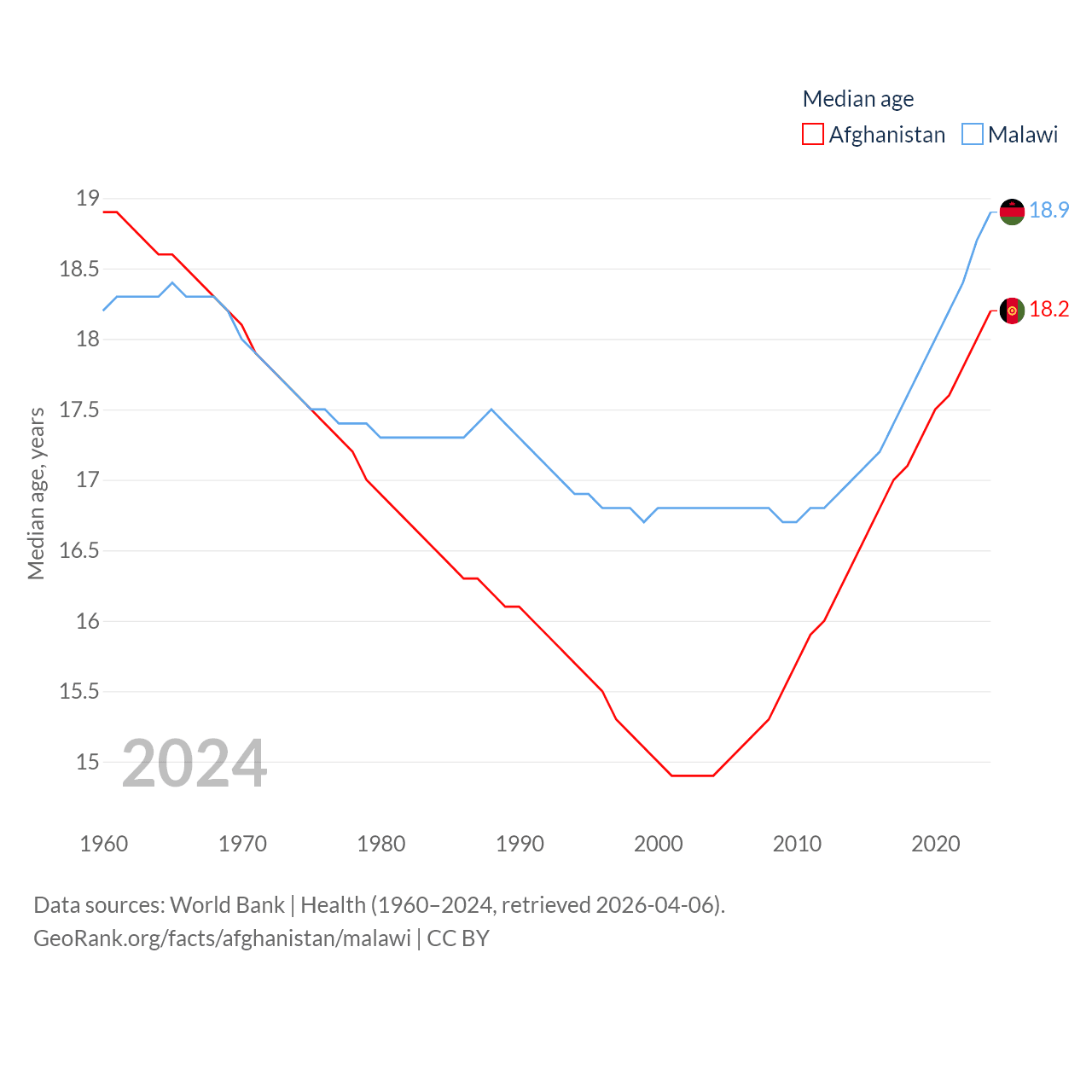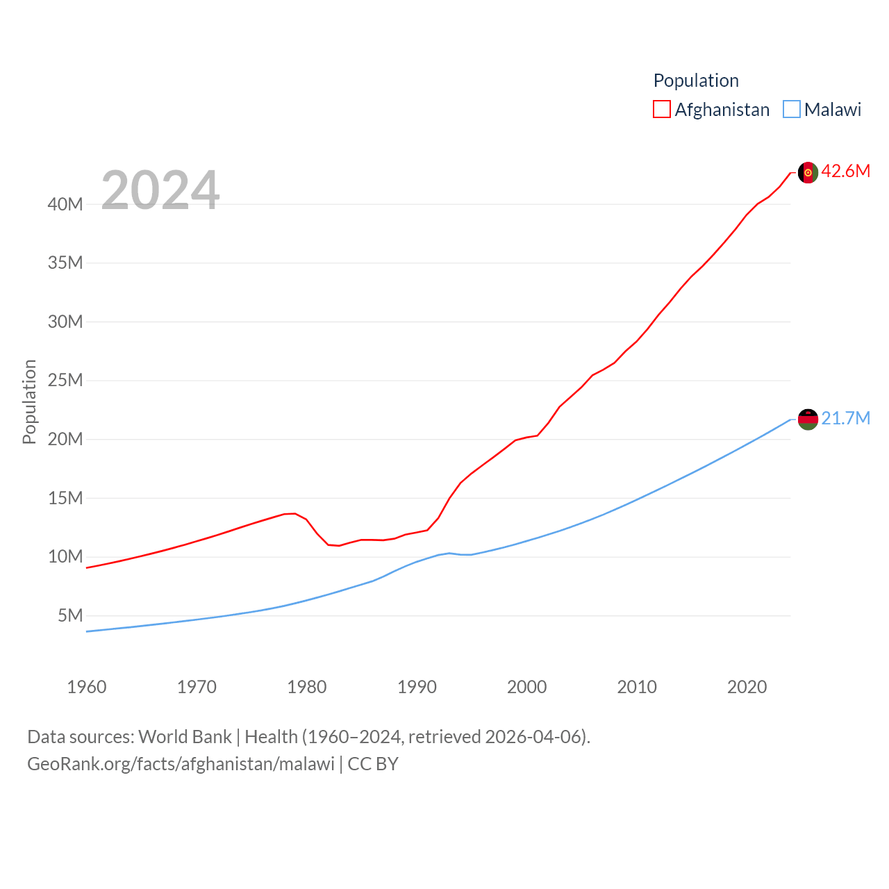 Afghanistan has a population of 42.6M (ranked 36/197), compared with 21.7M in Malawi (ranked 62/197). Afghanistan's land area is 251,827 sq mi versus 36,402 sq mi for Malawi (ranked 40th vs. 107th).