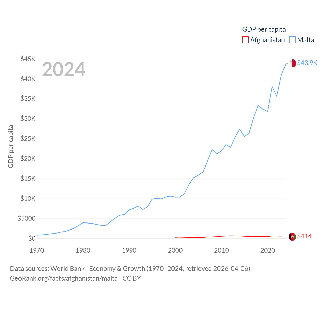 By GDP, Afghanistan ranks 137/197 ($17.2B) and Malta ranks 119/197 ($25B). By GDP per capita, Afghanistan ranks 196/197 ($414), while Malta ranks 28/197 ($43,899).