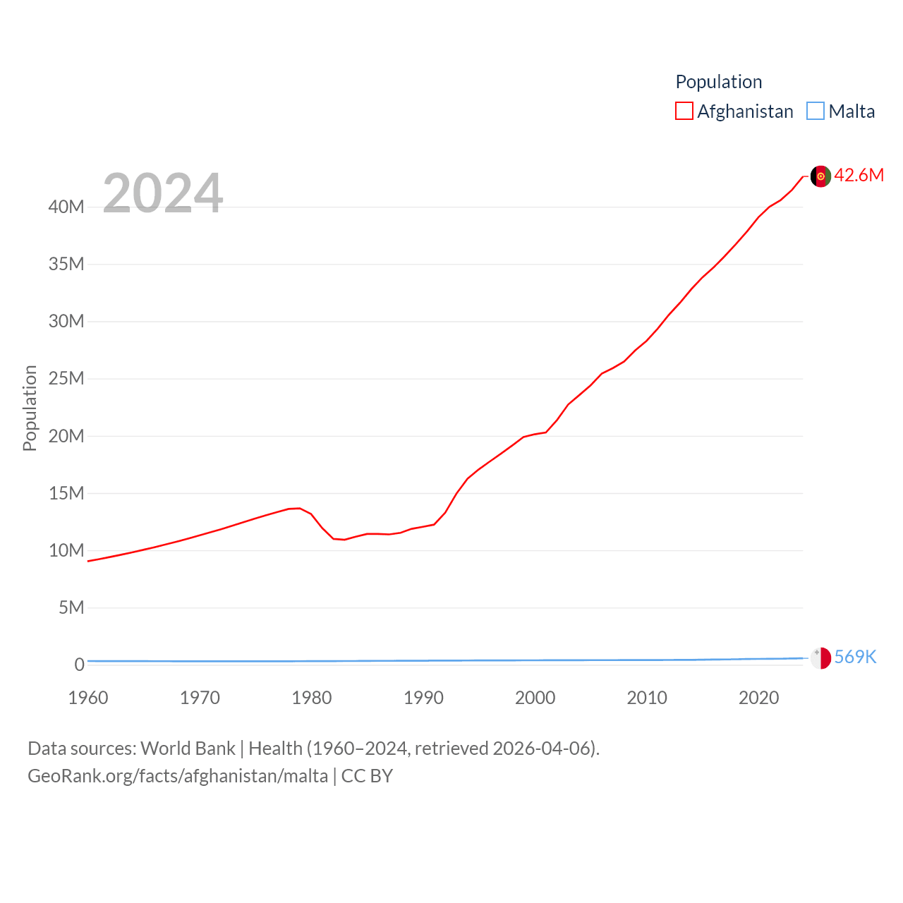 Afghanistan has a population of 42.6M (ranked 36/197), compared with 569K in Malta (ranked 167/197). Afghanistan's land area is 251,827 sq mi versus 123.6 sq mi for Malta (ranked 40th vs. 187th).