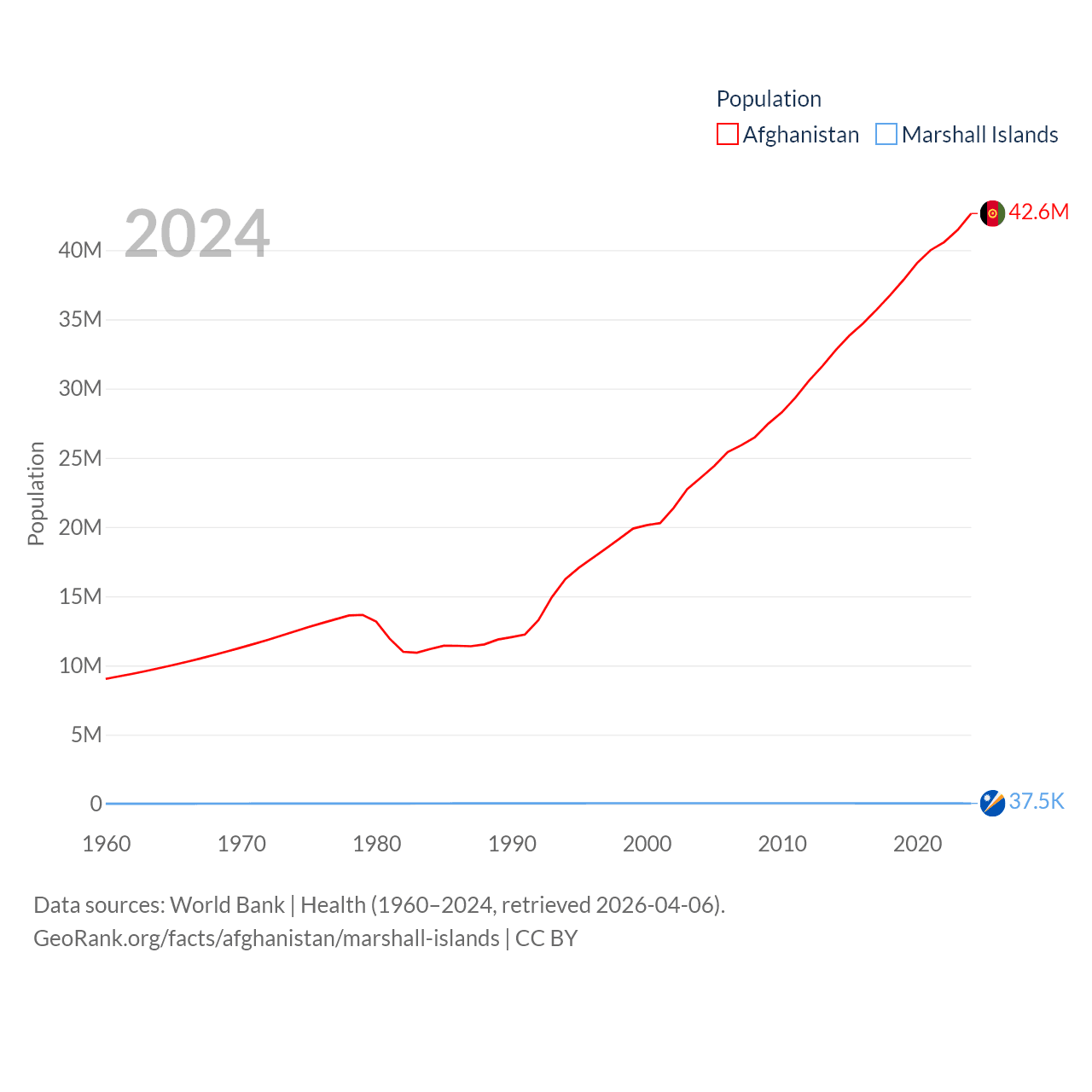Afghanistan has a population of 42.6M (ranked 36/197), compared with 37.5K in The Marshall Islands (ranked 192/197). Afghanistan's land area is 251,827 sq mi versus 69.5 sq mi for The Marshall Islands (ranked 40th vs. 191st).