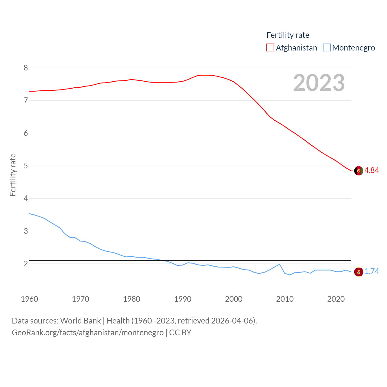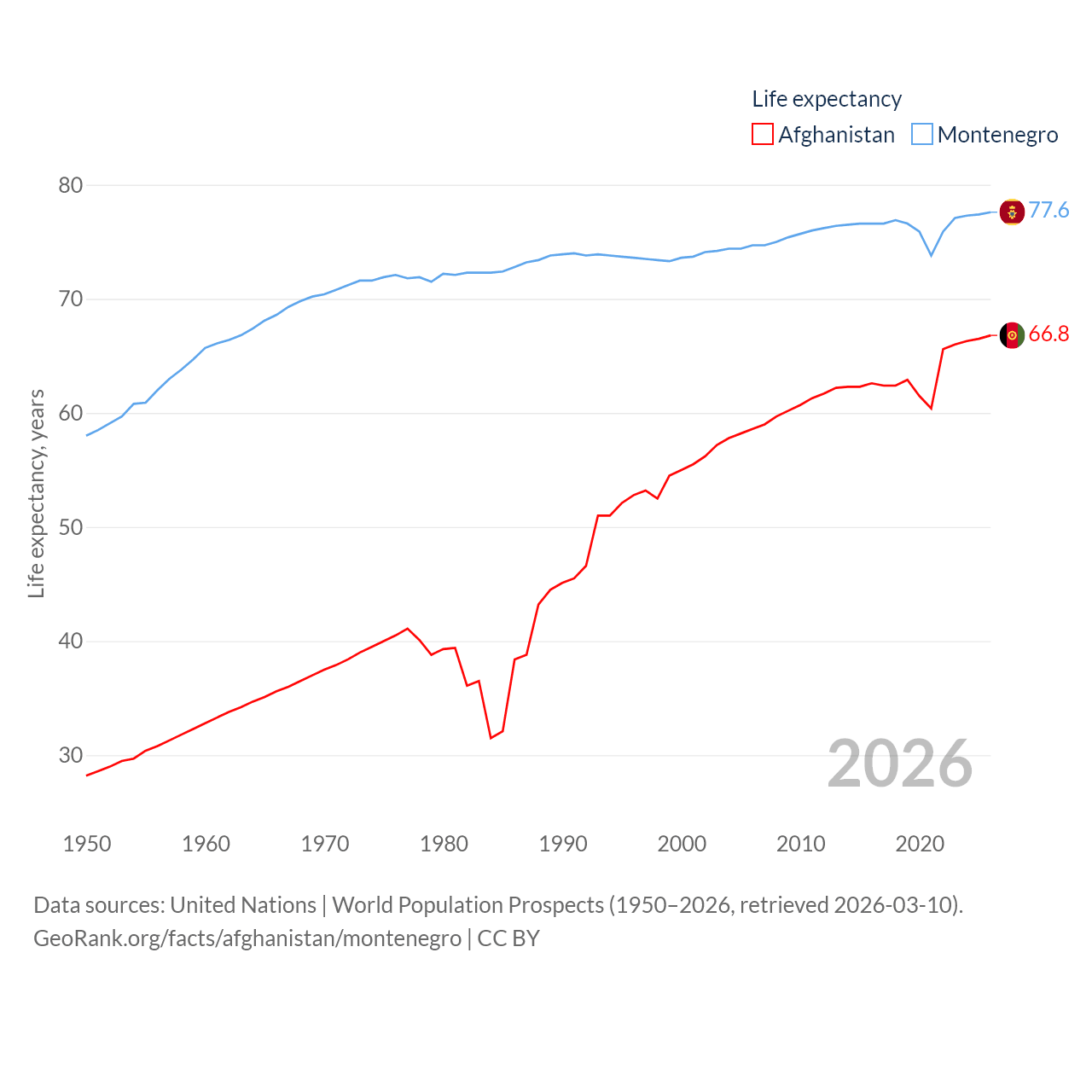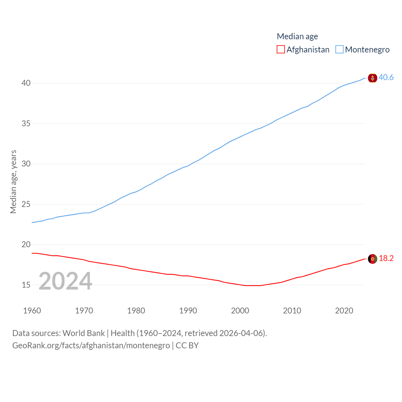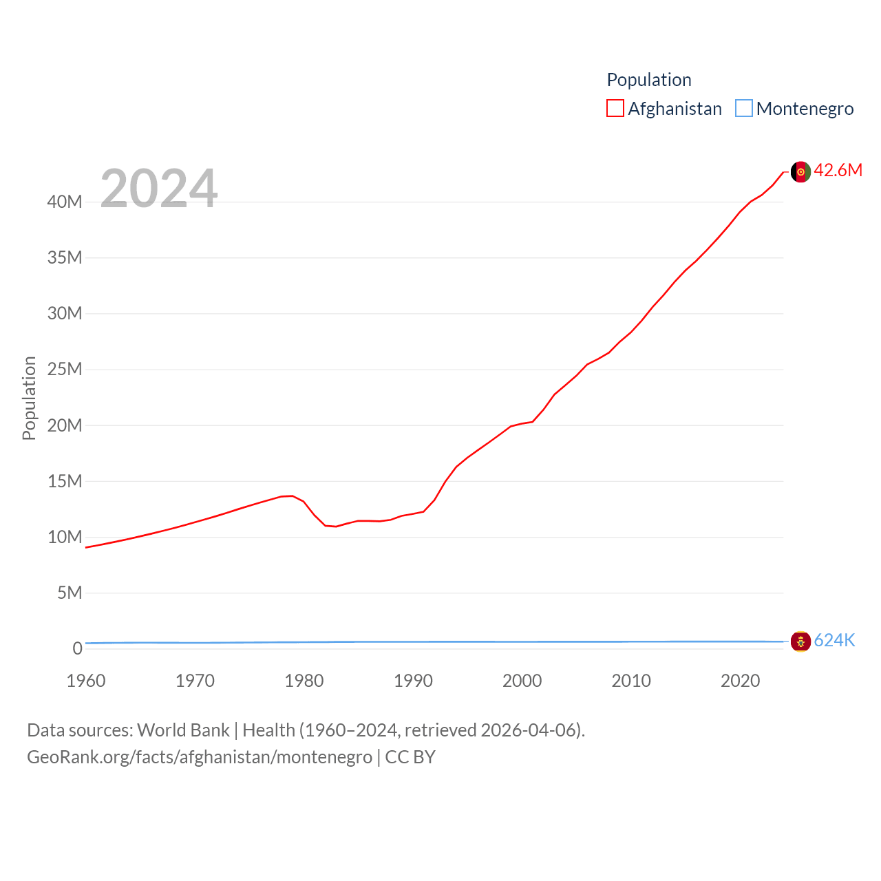 Afghanistan has a population of 42.6M (ranked 36/197), compared with 624K in Montenegro (ranked 166/197). Afghanistan's land area is 251,827 sq mi versus 5,193 sq mi for Montenegro (ranked 40th vs. 156th).